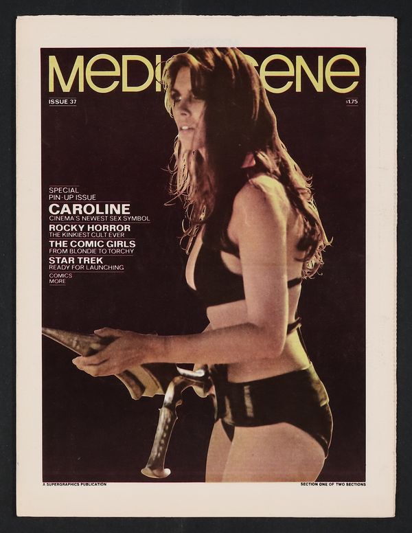 Jim Steranko's fine zine covering popular entertainment. Tabloid newspaper format (all issues come folded) but on good quality white paper stock. Special pin-up issue. Caroline Munro cover and photo feature, the comic girls (part 1) by Steranko, Star Trek, Rocky Horror Picture Show, art of Virgil Finlay. Comics news. 36 pages in two sections; partial color. Cover price $1.75.