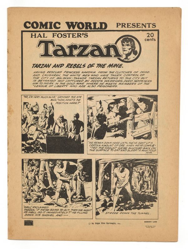 Published 1969 by No publisher listed/fanzine.$22.00No number or date. Published by Memory Lane (same as Captain George's Comic World"). "Tarzan and Rebels of the Mine." 16 pages of Tarzan by Hal Foster. Black and white; newsprint; 8-in. x 10-7/8 in. Cover price $0.20.