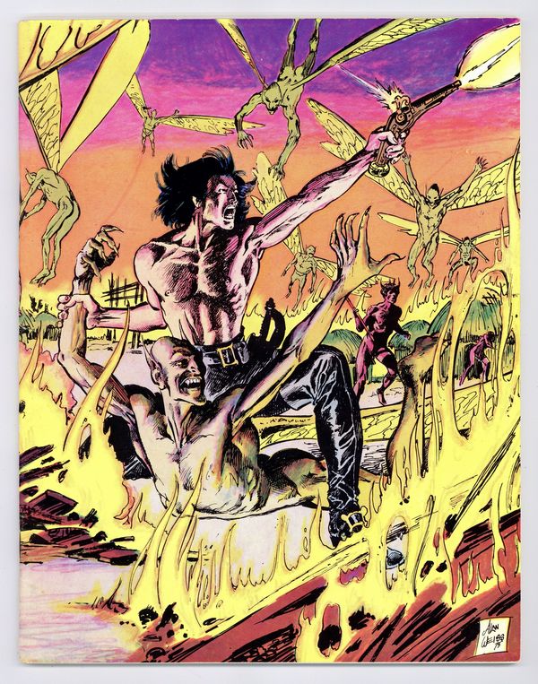 Published Sep 1975 by Arnold M. Fenner.$16.00Wraparound cover by Alan Weiss. REH fiction: "Guns of Khartoum" and "The Brazen Peacock." Interview with Glenn Lord. Solomon Kane portfolio by Alan Weiss. Articles on REH fanzines and REH imitators L. Sprague de Camp, Lin Carter, and Roy Thomas. Illustrations by Stephen Fabian, Alex Nino, Roy Krenkel, Steve Leialoha, Howard Chaykin, Walt Simonson, and Craig Russell. Pin-ups of "Muriela" from the Conan story "Jewels of Gwahlur" (looks suspiciously like Caroline Munroe, but the model is not identified). Magazine format; black and white; 64 pages on high-quality white paper stock. Cover price $3.50.