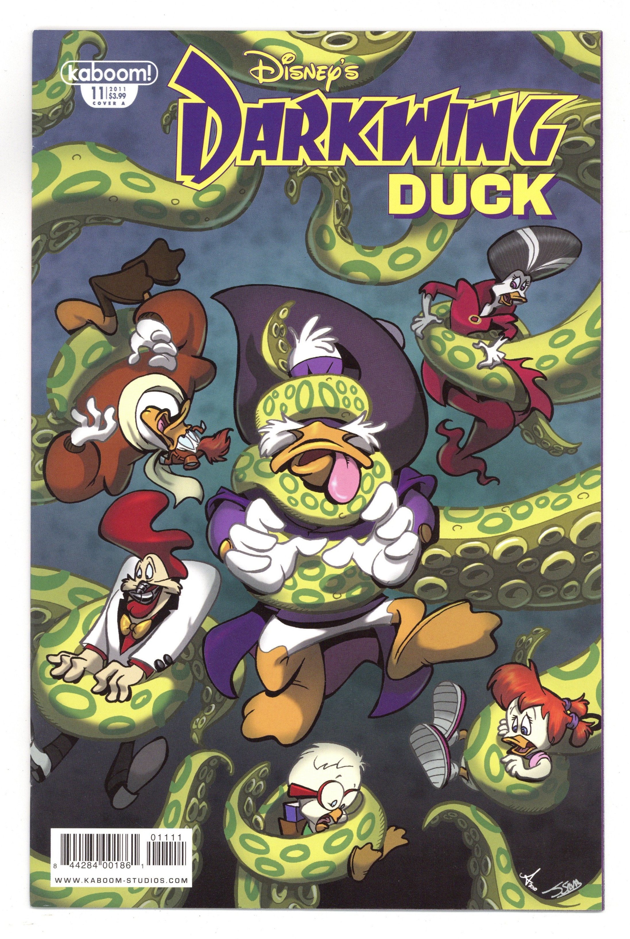 Tags: Disney Ducks & MicePublished Apr 2011 by Boom Studios.$13.50Cover by James Silvani. F.O.W.L Disposition: Part 3 - (W) Ian Brill (A) James Silvani 'Revenge' is a dish best served cold, but 'Double-Cross' turns out to be a dish best served - with duck? In this epic installment of the Disney Afternoon juggernaut, nothing is as it seems, or is it? Tune in and find out as Part 3 of Darkwing Duck's 'F.O.W.L. Disposition' charges on! Cover price $3.99.