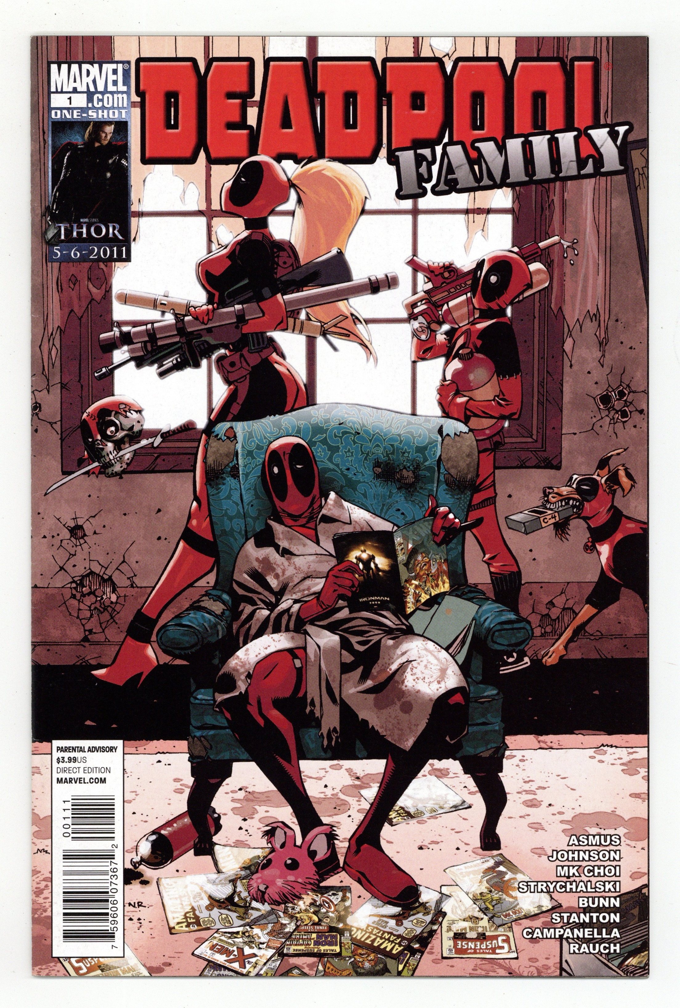 Written by JAMES ASMUS, CULLEN BUNN & MARY HK CHOI Penciled by DARNELL JOHNSON, DOMINIKE STANTON & IRENE STRYCHALSKI Cover by JASON PEARSON Super-important, double-sized one-shot. They're back - and they're up to no good - in three stories that will forever change the way you look at yourself and the world around you and break every funny bone in your body. CHILL as Lady Deadpool and Headpool undergoe invasive analysis to ferret out the root cause of their majorly abusive frenemieship in 'Head Shrunk and Disorderly'...THRILL as Kidpool and Dogpool embark on a 100-ton mechanized joy ride in 'Show and Raise Hell'...and uhm...GET ILL as Dogpool rampages from makes a brand-new archenemy in 'Uncertainty Princi-Pals'! Enter: Voidmutt! 48 PGS Cover price $3.99.