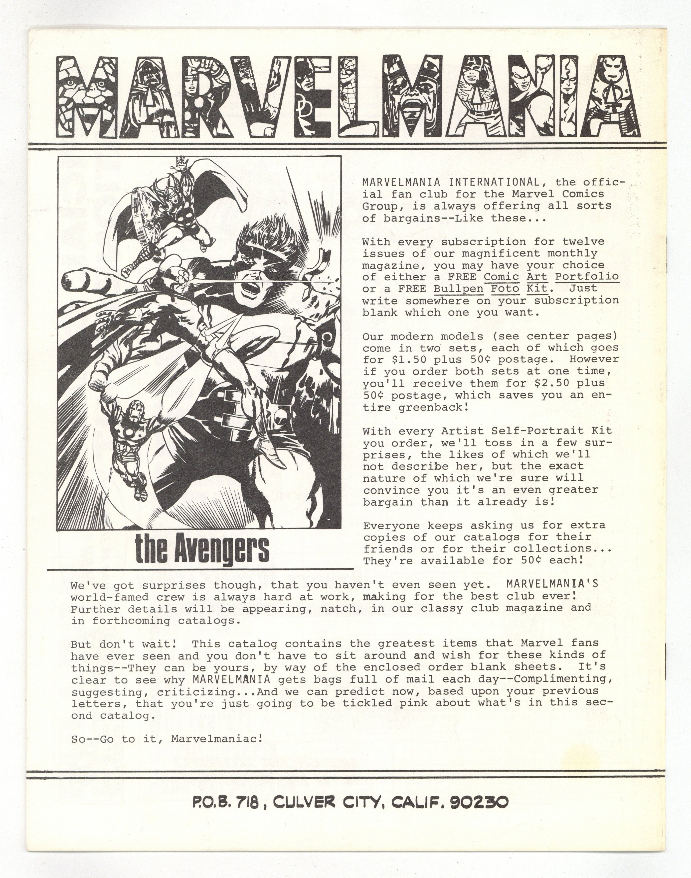 Catalog of Marvelmania merchandise: membership kit, magazine, super-hero portfolios, super-hero models, artist self-portrait portfolio, comic art portfolio, super-hero posters, bullpen fotokit, and official club stationary kit. Sal Buscema front cover. Barry Windsor-Smith/Syd Shores back cover illustration. No date (probably 1970). 8.5 x 11 in.; black and white; 16 pages.