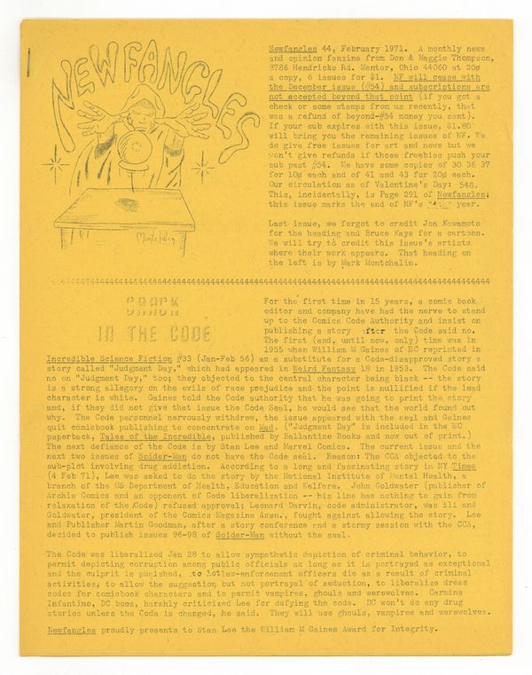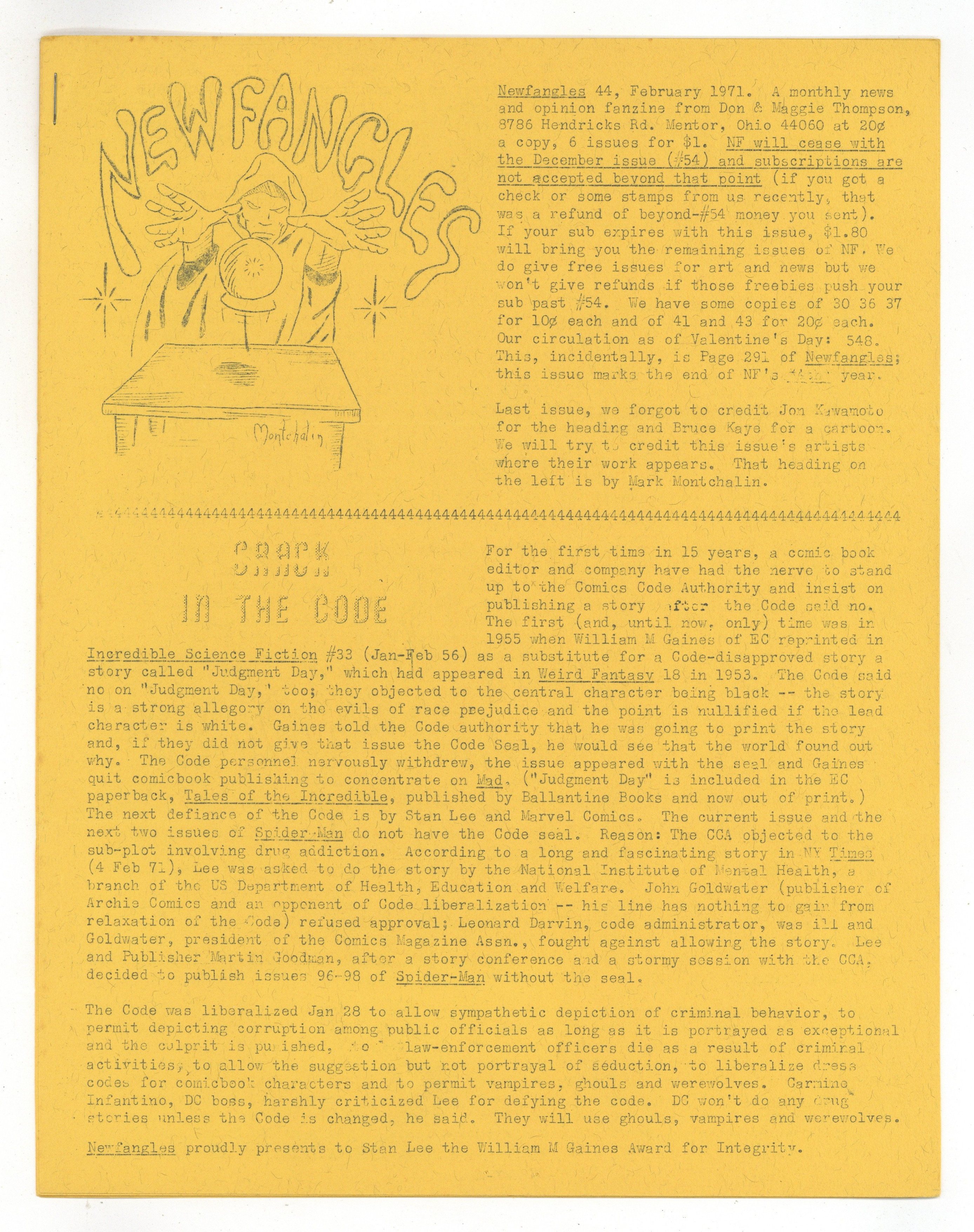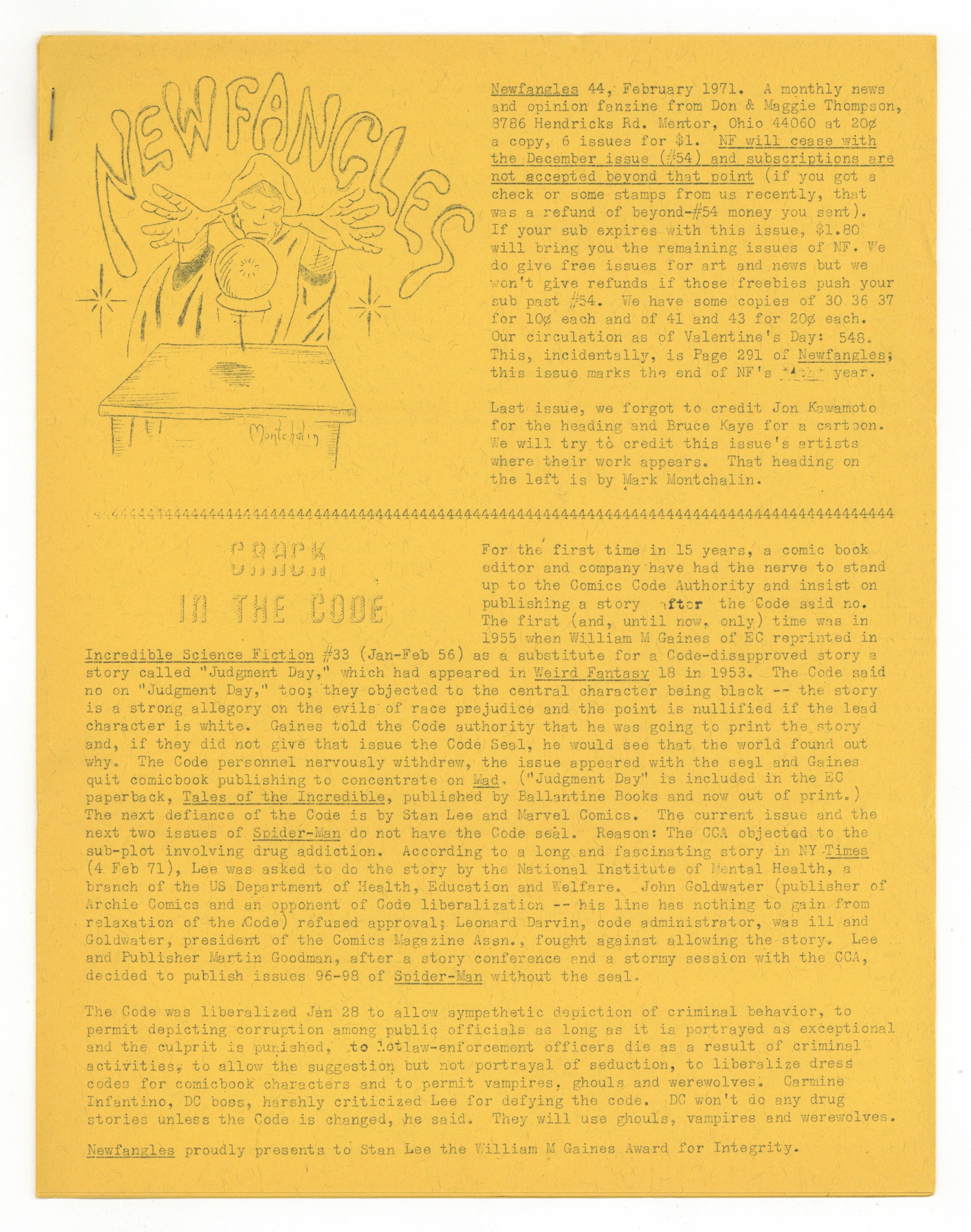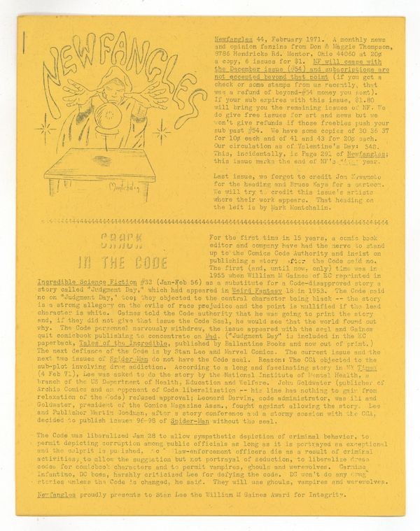 Published Feb 1971 by Don and Maggie Thompson.$50.00News zine published by Don and Maggie Thompson. This issue includes news about the non-code anti-drug issues of Amazing Spider-Man. 10 pages; circulation 548. Cover price $0.20.