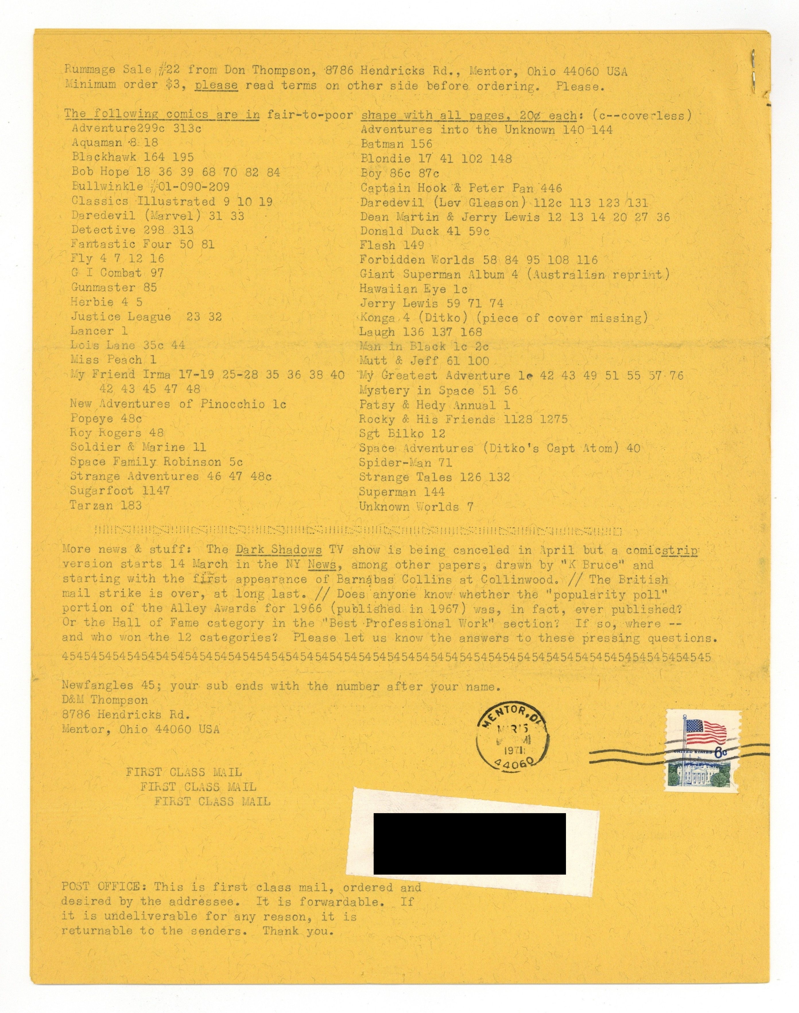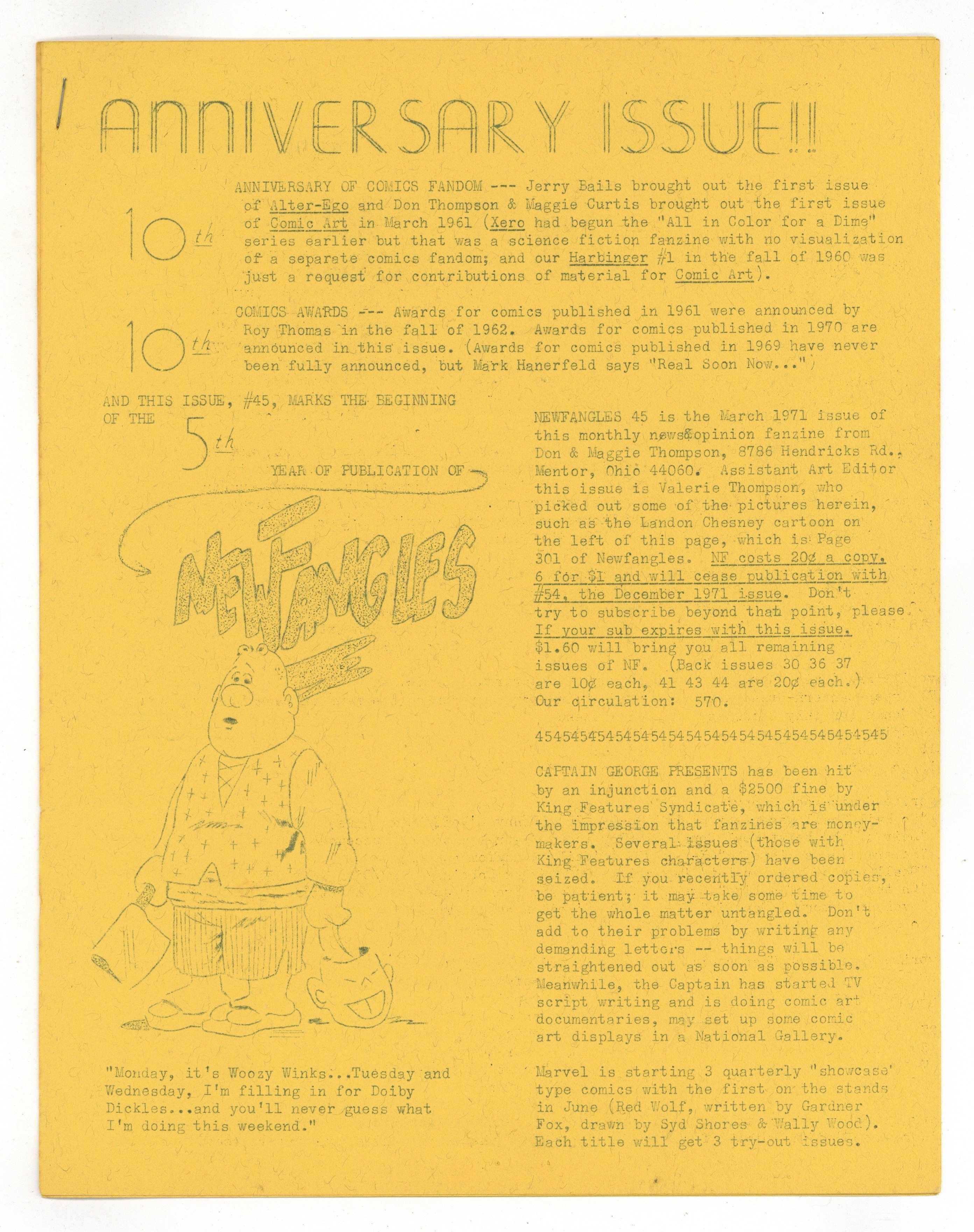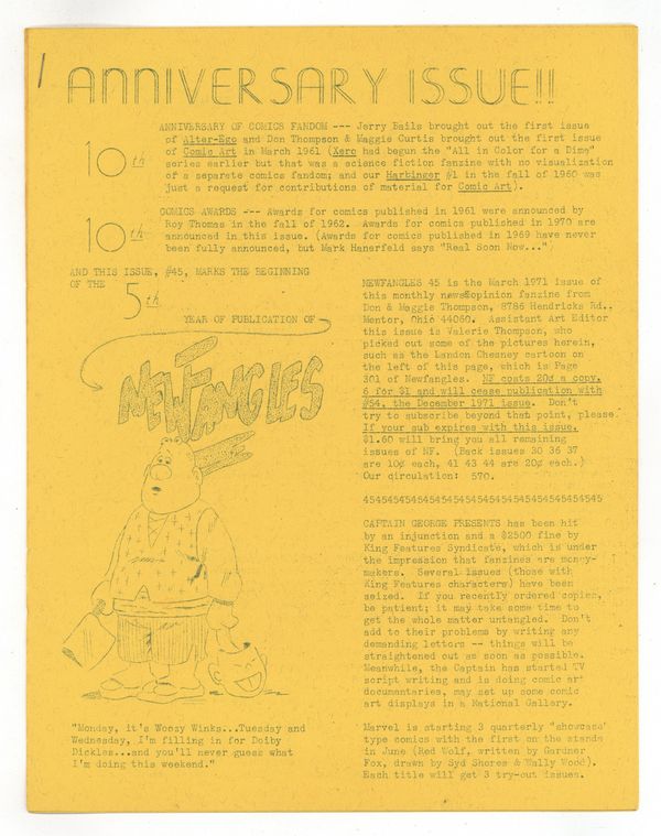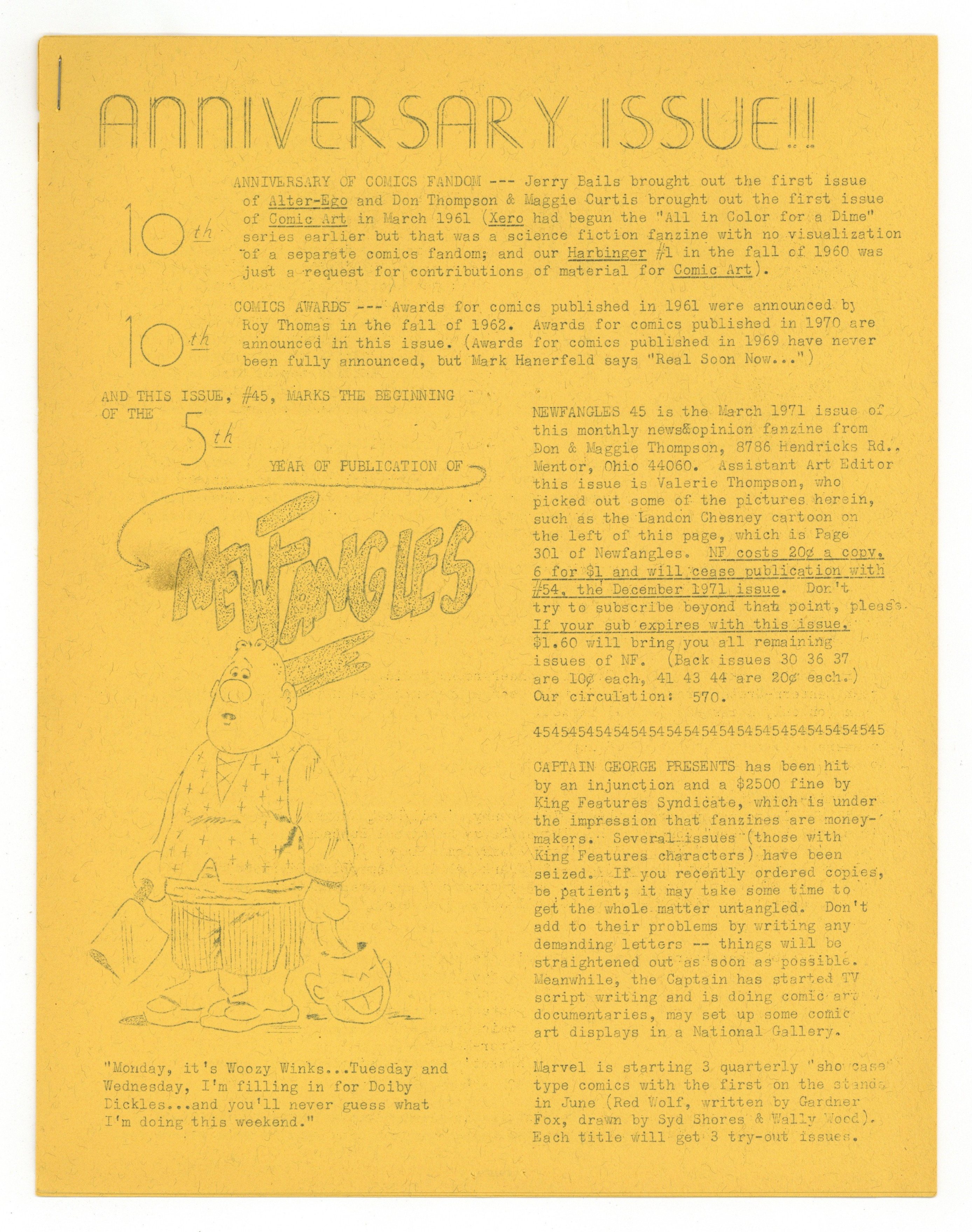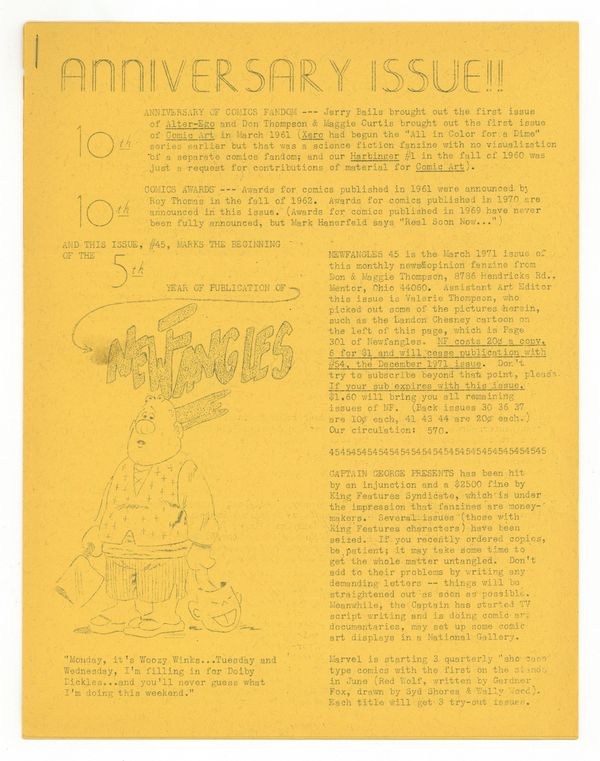 Published Mar 1971 by Don and Maggie Thompson.$37.00News zine published by Don and Maggie Thompson. This issue includes results from the Goethe Awards for comic books. * pages; circulation 570. Cover price $0.20.