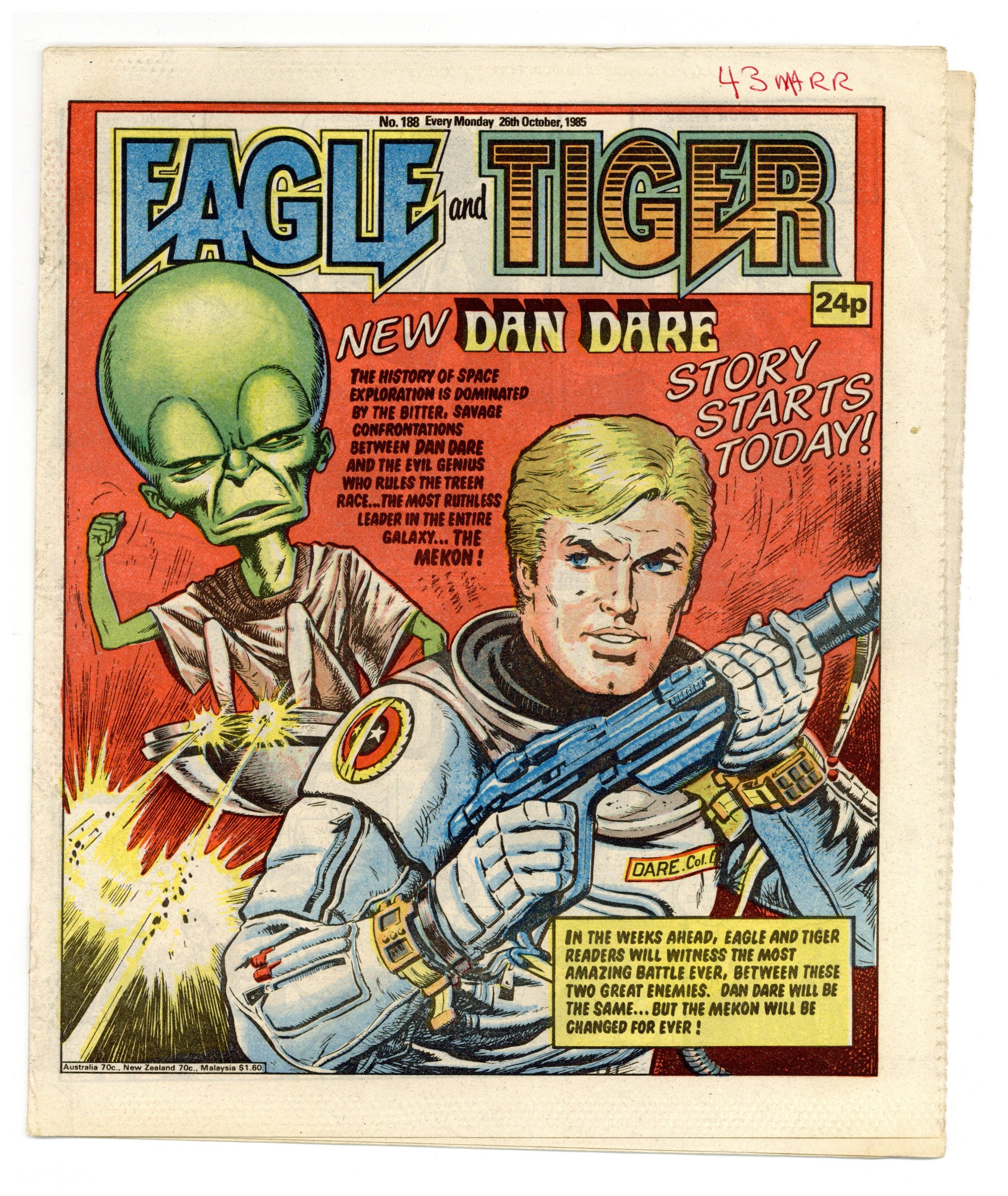 Oct. 26, 1985. "Eagle and Tiger" on cover. Dan Dare, plus other features. Published in the United Kingdom, 8-1/2-in. x 11-1/2-in, 32-pages including cover, all newsprint stock. Mix of color and black/white interior.