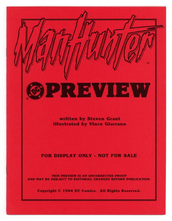 Uncorrected proof of the first 12 pages of Manhunter 1 by Steven Grant and Vince Giarrano. These booklets were sent to retailers to help promote the upcoming series. 8.5-in. x 11-in.; black and white; 16 pages with color cardstock cover.