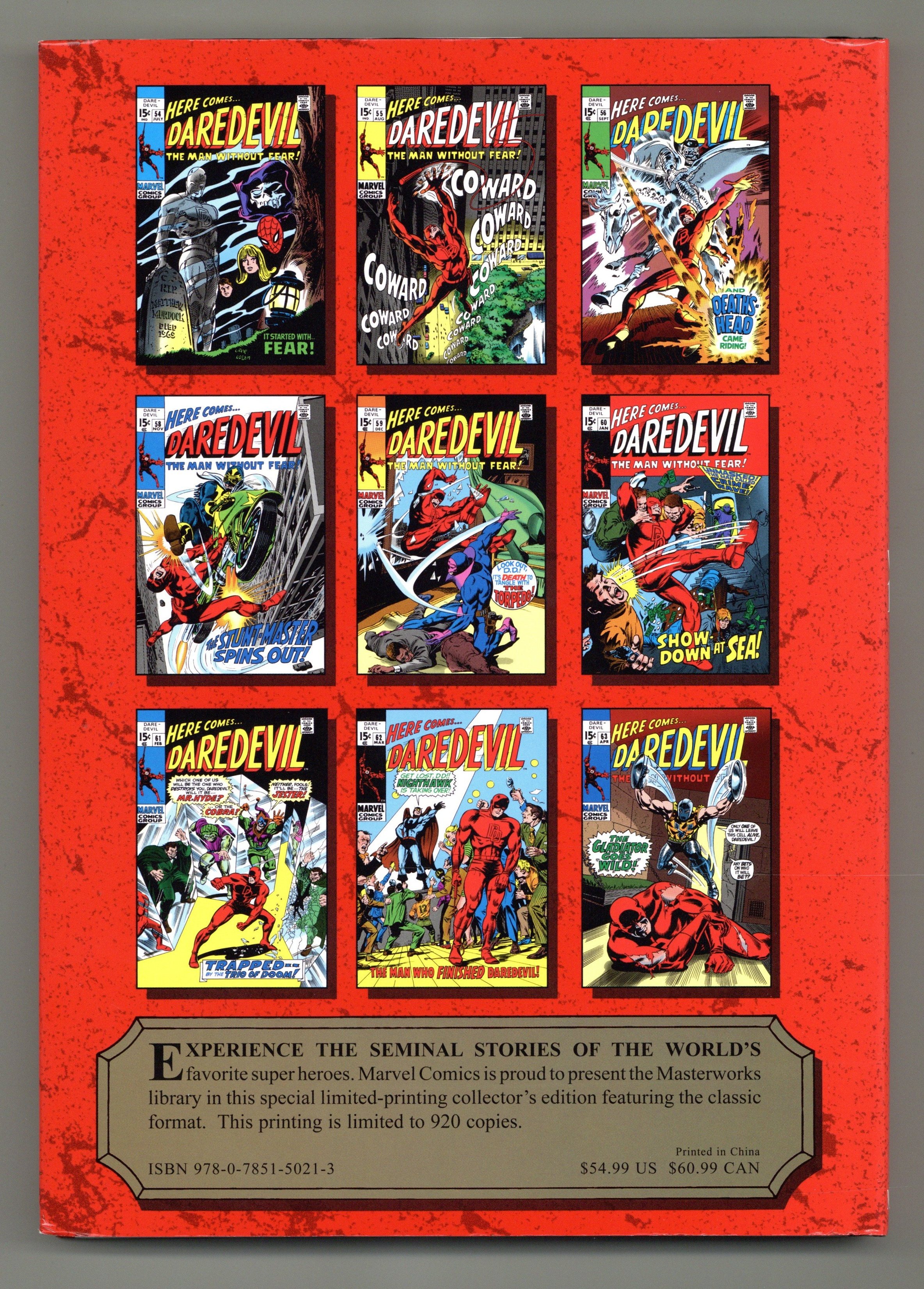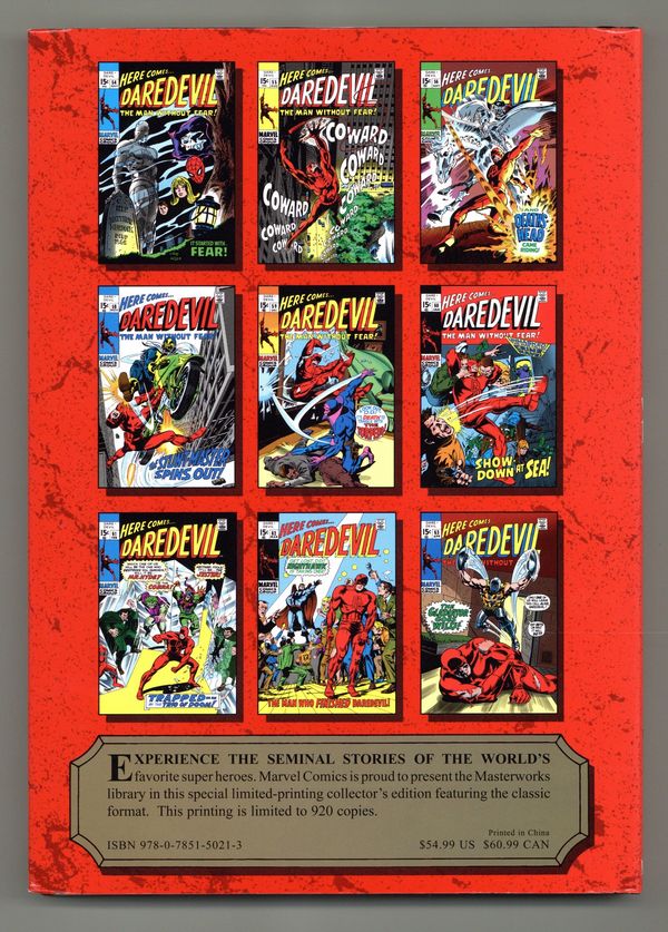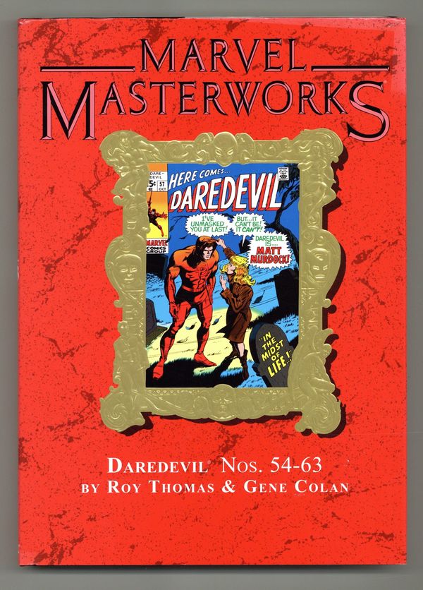 Volume 163 - 1st printing. "Daredevil: Book 6" Collects Daredevil (1964-1998 1st Series) #54-63. Written by ROY THOMAS. Art and cover by GENE COLAN. With Matt Murdock thought dead to the world, Daredevil's adventures take on a whole new level of action, drama and excitement in the manner only Marvel can present - and it takes off with a test of courage that pits DD against Mr. Fear. Then comes the flaming skeleton horseman, Death's-Head - a villain with deep, unknown links to those closest to Daredevil. It's a classic battle that pushes Matt Murdock to reveal his identity to the lovely Karen Page at last - but will it bring them closer together, or force them apart? Also featured are the debut of Stunt-Master; the return of war vet Willie Lincoln; an encounter with the underworld mastermind Crime-Wave; a battle with the triple-threat team-up of Mr. Hyde, Cobra and Jester; the introduction and origin of Nighthawk; and a fight to the finish with the one and only Gladiator! Brought to you by Roy Thomas and the unmatched penciling talent of Gene Colan, they're MASTERWORKS one and all - so reserve your copy today! Hardcover, 224 pages, full color. NOTE: Limited to 920 copies. Cover price $54.99.