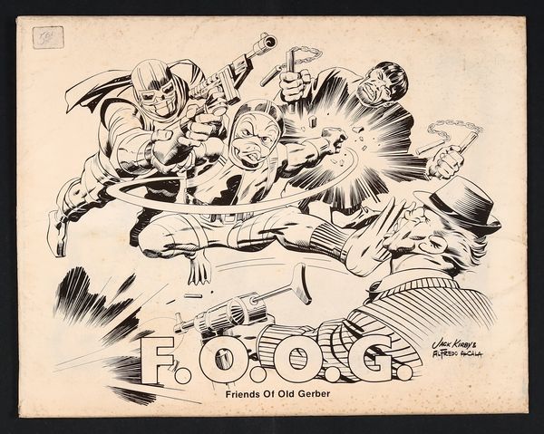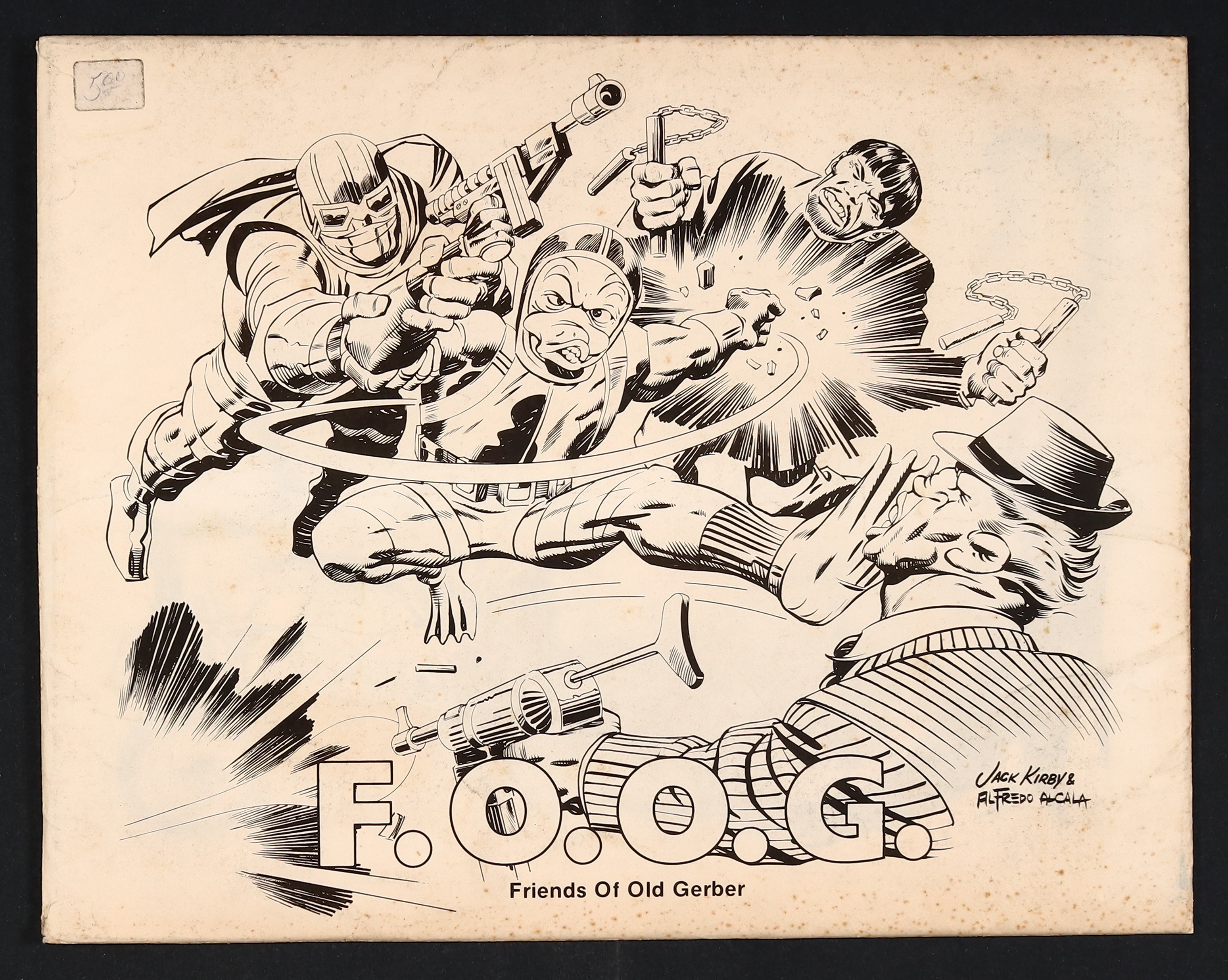 Published 1982$24.00Portfolio co-ordinated by Dave Sim to assist Steve Gerber (creator of Howard the Duck) in his legal expenses (FOOG stands for Friends Of Old Gerber). 10 black and white plates by Sim (Cerebus and Destoyer Duck), Gene Colan/Sim (Stewart the Rat), Berni Wrightson (Captain Stern), Frank Thorne (Ghita), Marshall Rogers (Captain Quick and the Foozle), Wendy Pini/Sim (Elf and Frost Giant), Jeff Jones (Ducks), Charles Vess (Faery Tales), Barry Windsor-Smith (Medusa), and Michael Kaluta (Mermaid). 11.25-in. x 14.25-in. Folder illustrated by Jack Kirby/Alfredo Alcala (Destroyer Duck).