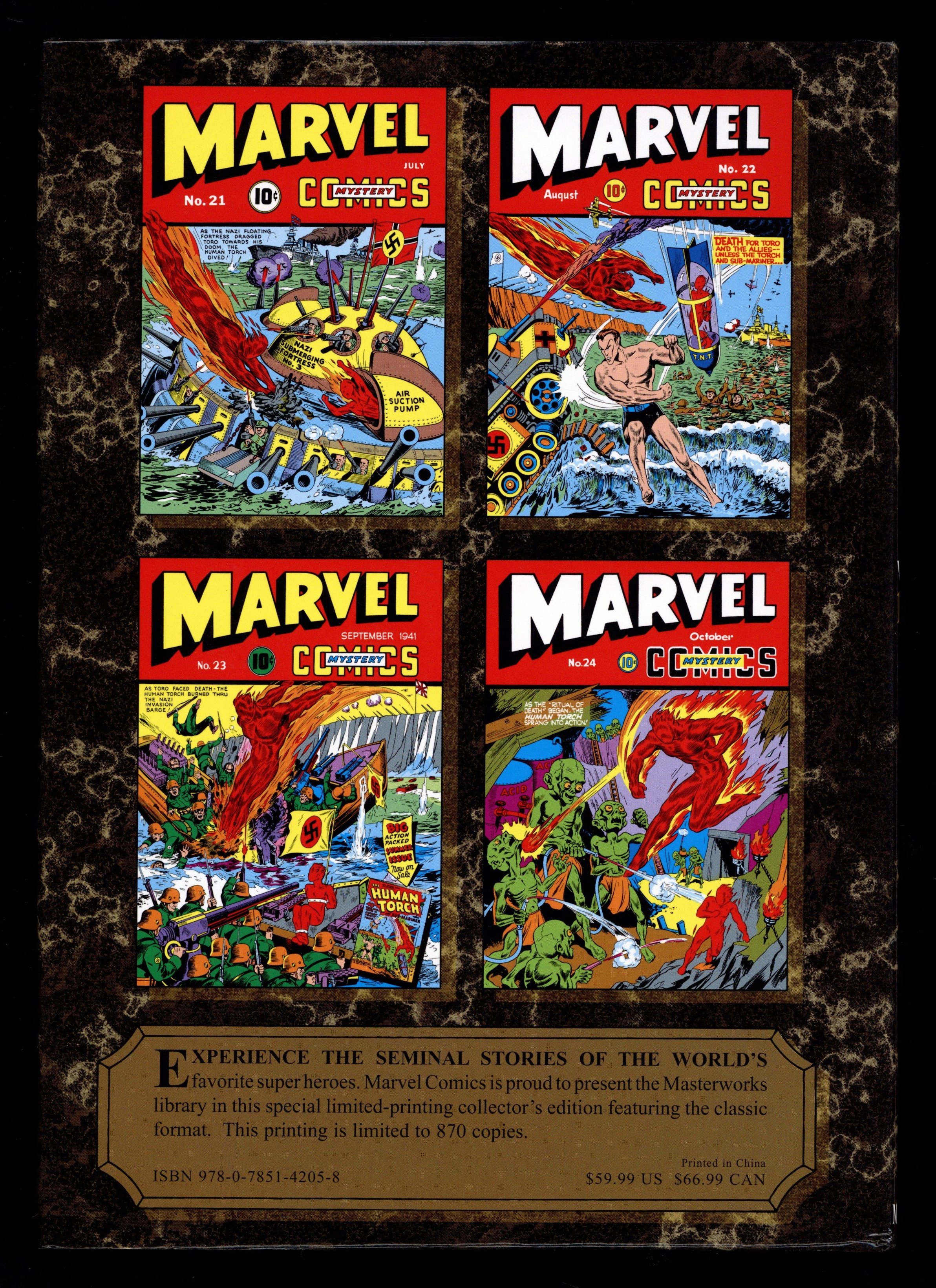 Volume 166 - 1st printing. "Golden Age of Marvel Comics: Book 6!" Collects Marvel Mystery Comics (1939-1949) #21-24. Written by STAN LEE, JOE SIMON, and RAY GILL. Art by CARL BURGOS, BILL EVERETT, JACK KIRBY, PAUL GUSTAVSON, BEN THOMPSON, BOB OKSNER, AL GABRIELE, and SID GREENE. Cover by ALEX SCHOMBURG. The series that made Marvel the biggest name in comics continues its heralded run in the MARVEL MASTERWORKS! Headlined by the hottest hero of the Golden Age, the Human Torch, and the anti-hero with a temper just as fiery, Prince Namor the Sub-Mariner, MARVEL MYSTERY COMICS presents a collection of stories that defined the medium! Torn from the turbulent headlines of 1941 America, each tale crackles with the tension of a nation on the brink of war - and there's no doubt these heroes were ready to fight! And arriving on the scene to prove it is Jeffrey Mace, a.k.a. the Patriot, making his MARVEL MYSTERY debut! Of course, each 64-page issue is also jam-packed with the adventures of Ka-Zar, protecting his jungle domain from Nazi invaders; school-boy sleuth Terry Vance and his monkey compatriot, Dr. Watson, solving mind-boggling mysteries; other-dimensional hero the Vision, fighting the weirdest menaces imaginable; and the gritty Angel, battling evil from gangsters to ghosts! Hardcover, 280 pages, full color. NOTE: Limited to 870 copies. Cover price $59.99.