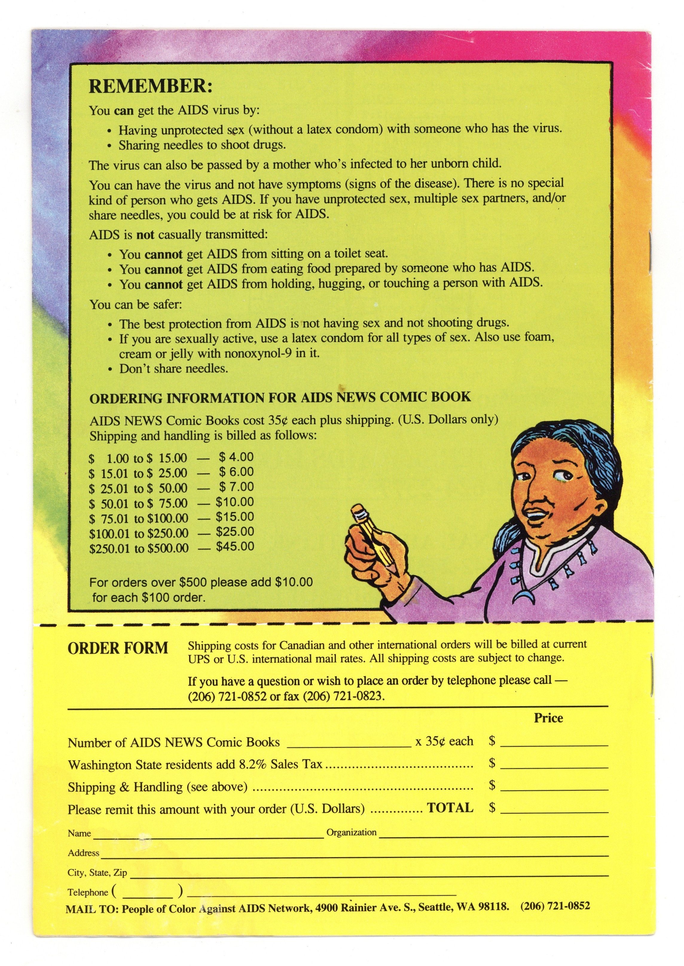 AIDS prevention promotional comic produced by People of Color Against AIDS Network (POCAAN). 6-7/8 in. x 10-1/8 in.; full color; 16 pages on white paper.