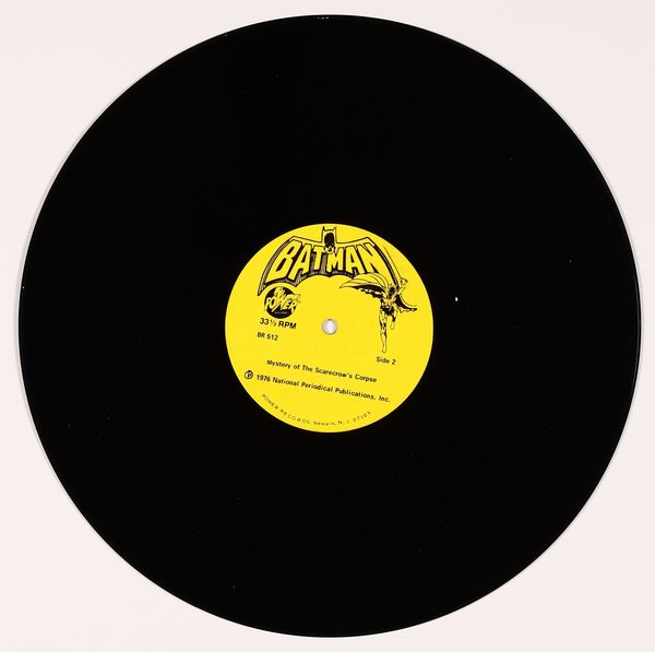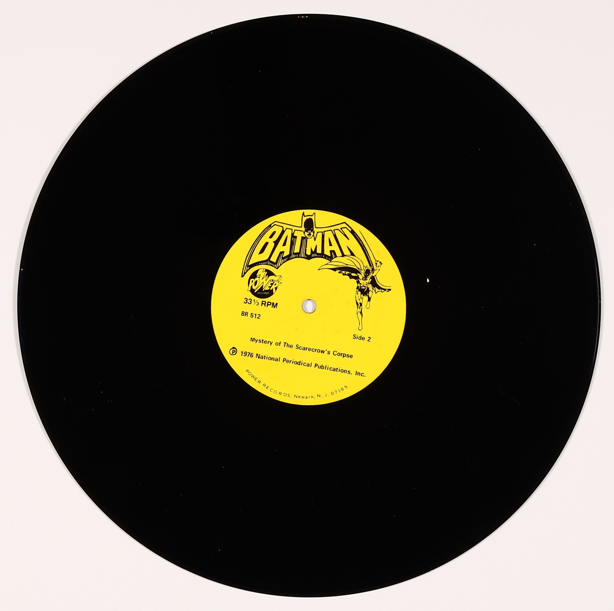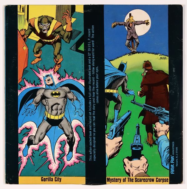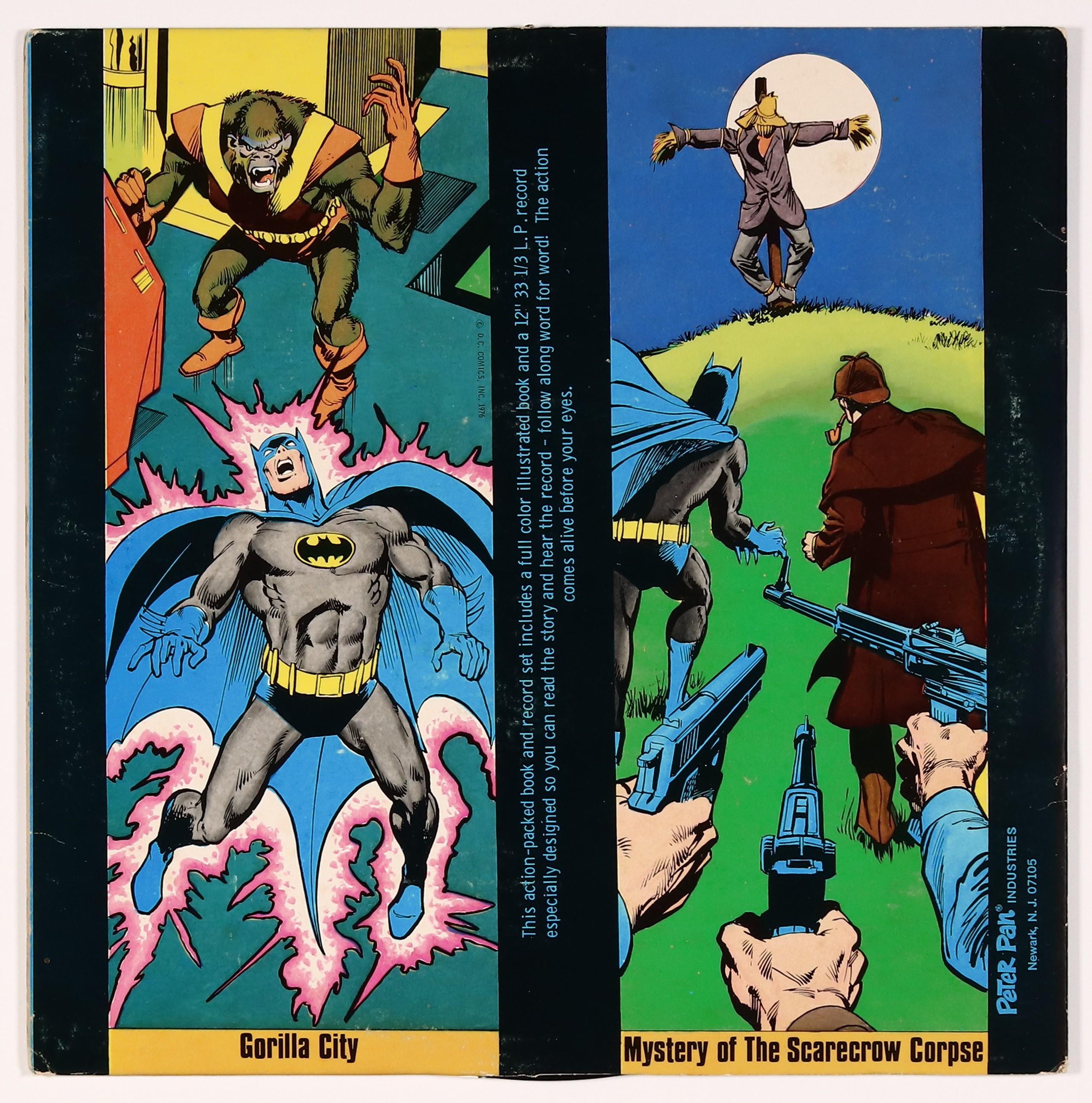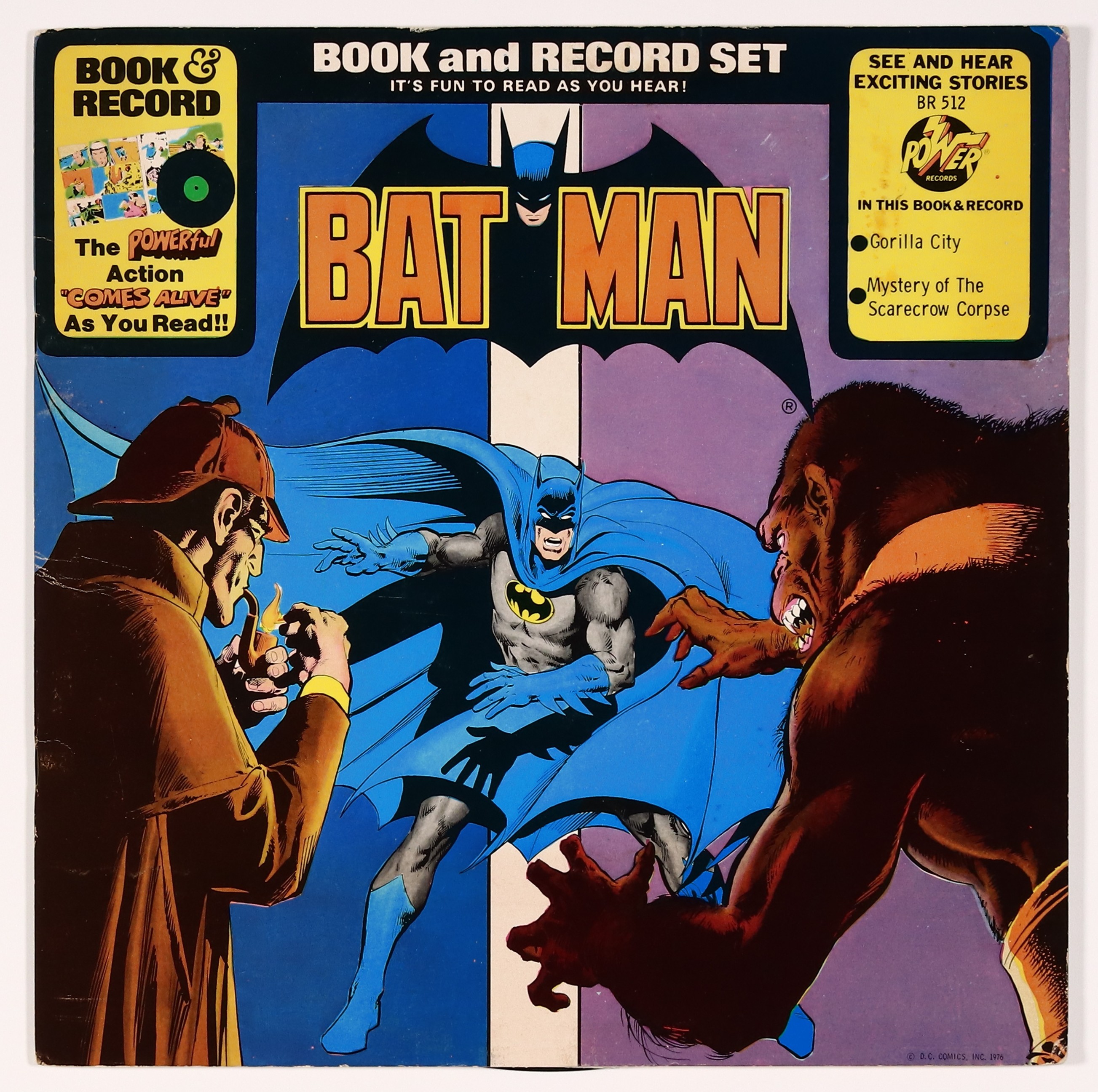 Published 1976 by Power Records.$59.00Cover pencils by Neal Adams. Cover inks by Dick Giordano and Joe Rubinstein (blacks). Written by Cary Bates and Elliot Maggin. Pencils by José Luis García-López. Inks by Frank Springer and Dick Giordano (Batman only). Includes the Batman stories "Gorilla City" (with Gorilla Grodd) and "Mystery of the Scarecrow Corpse" (with Sherlock Holmes). It's fun to read as you hear! The powerful action "comes alive" as you read! 12-in. x 12-in., 16 pages, full color with cardstock cover and white non-gloss interior paper stock. With a 33-1/3 RPM record. NOTE: Any copy listed here, regardless of grade assigned, includes both comic and 45 RPM record. Cover price $0.79.