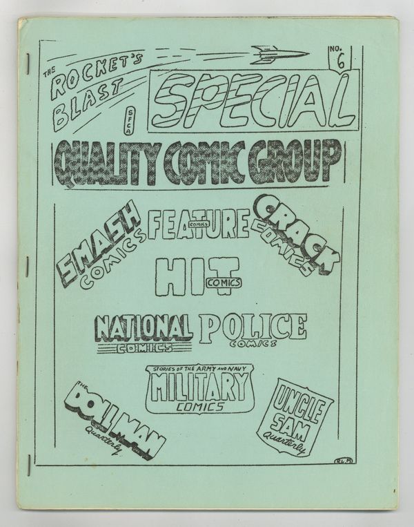 Rocket's Blast Special #6 (45 pgs.; ditto), with Quality Comics cover art by Raymond Miller. The Rocket's Blast is THE classic comics adzine from the 60s thru the 80s, and this issue is one of the Special Editions. It features a lengthy article on the Quality Comics Group (Police Comics, National Comics, Smash Comics, etc.) by Raymond Miller and Dave Bibby. Edited by G.B. Love. Fall, 1965. 50-cent cover price. Circulation: 500. Cover price $0.50.