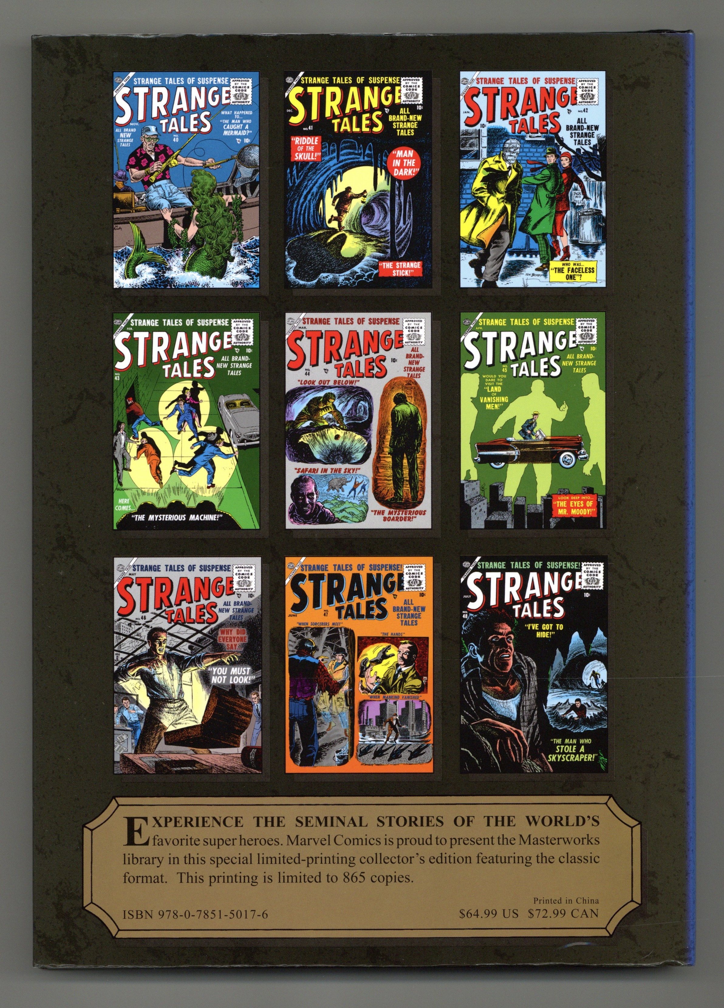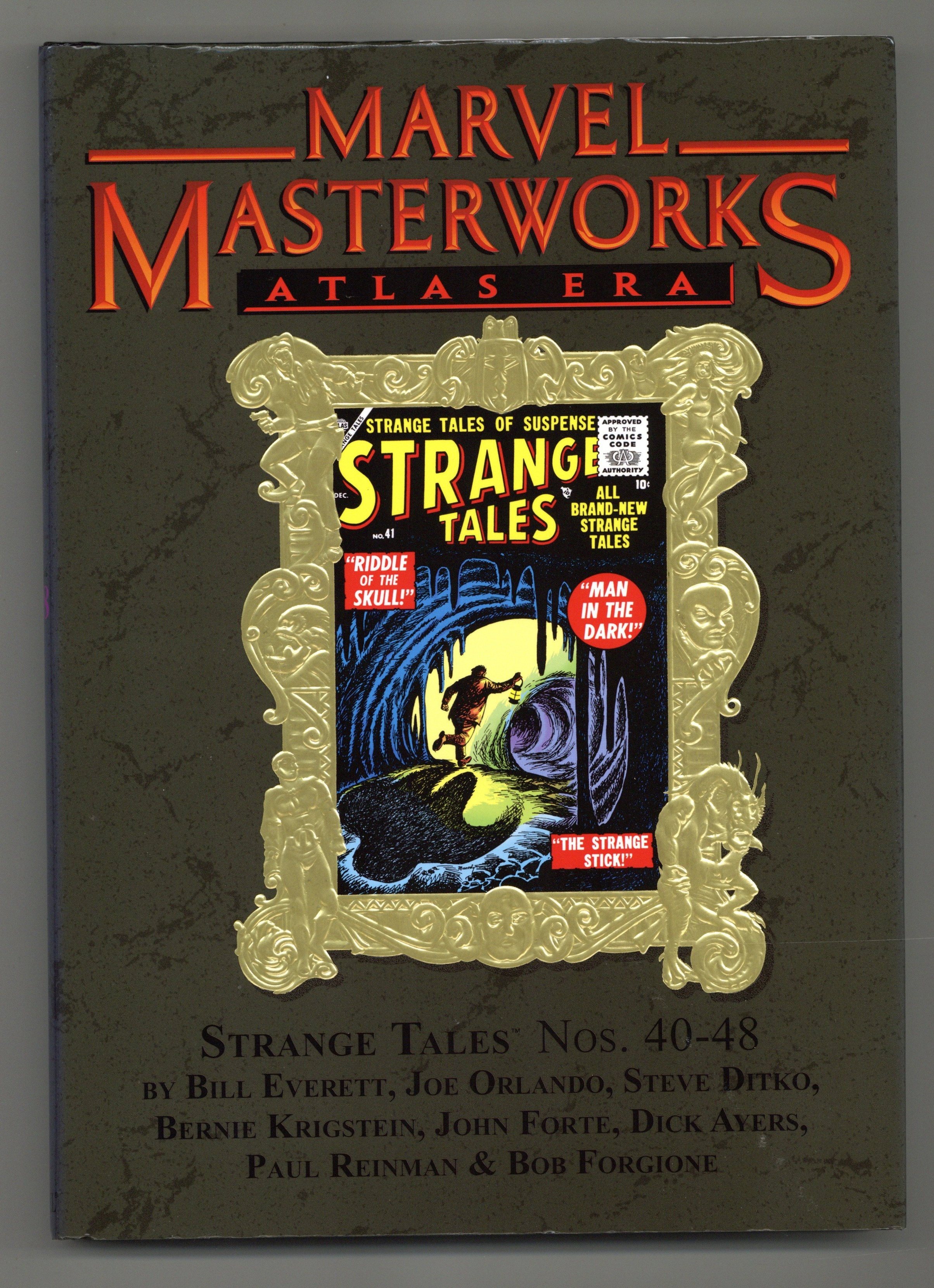 Volume 168 - 1st printing. "Atlas Era - Strange Tales: Book 5!" Collects Strange Tales (1951-1976 1st Series) #40-48. Cover by JOE MANEELY. From the dark heart of the Atlas Era comes another dose of bizarre and exciting STRANGE TALES! Crafted by a host of the most talented illustrators to ever grace the comic-book page - from early work by Steve Ditko to accomplished efforts by Bill Everett - each story is a page-turning pleasure from the days when comics were as frightful as they were delightful! A heaping helping of bug-eyed aliens, unexplored caves, time machines, mermaids and atomic bombs will prove to you there's a taste of something for everyone with a penchant for the fearsome and the fantastic. And with an in-depth introduction by noted Atlas scholar Dr. Michael J. Vassallo, there's no other place where comics' most contentious era is presented and studied in such detail as here. So reserve your copy today, and march on with the MARVEL MASTERWORKS! Hardcover, 248 pages, full color. NOTE: Limited to 865 copies. Cover price $64.99.