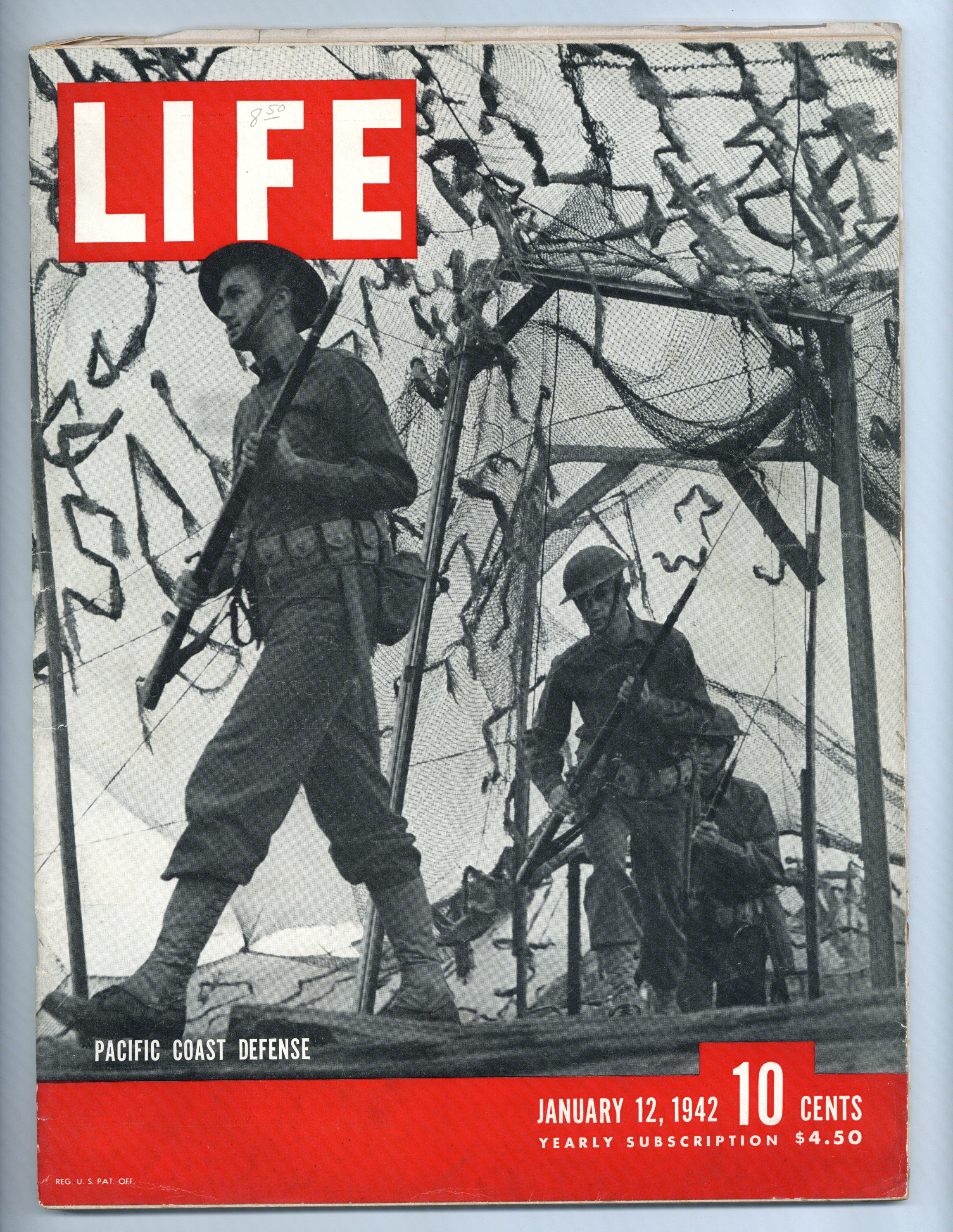 Published Jan 1942 by Clair Maxwell.$10.00January 12, 1942. Classic weekly news/photo magazine. In this issue: Pacific Coast defense; Rockefeller Center; Betty Bruce; macaroni and spaghetti standards; the war in Singapore; and more. 10.5-in. x 13.75-in.; partial color; 96 pages. Cover price $0.10.