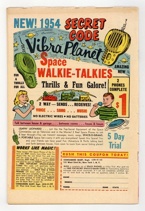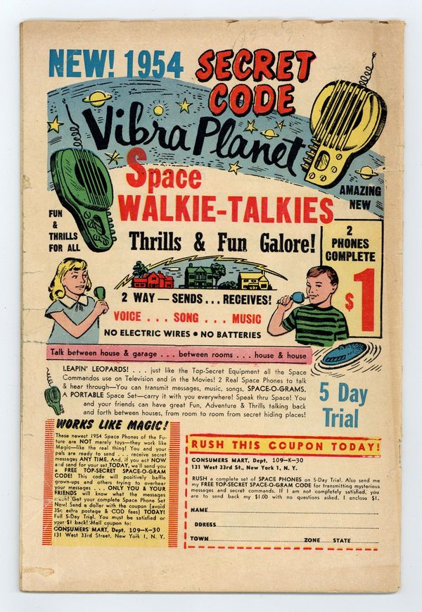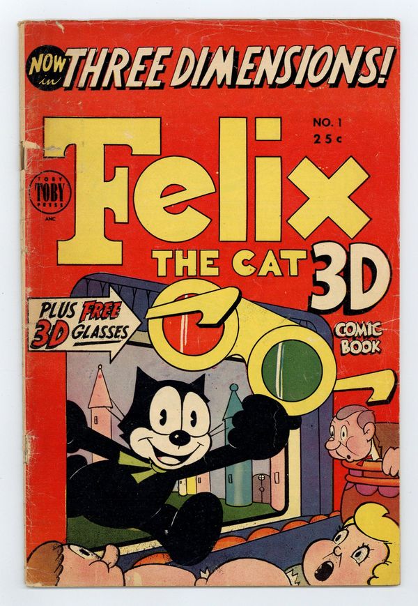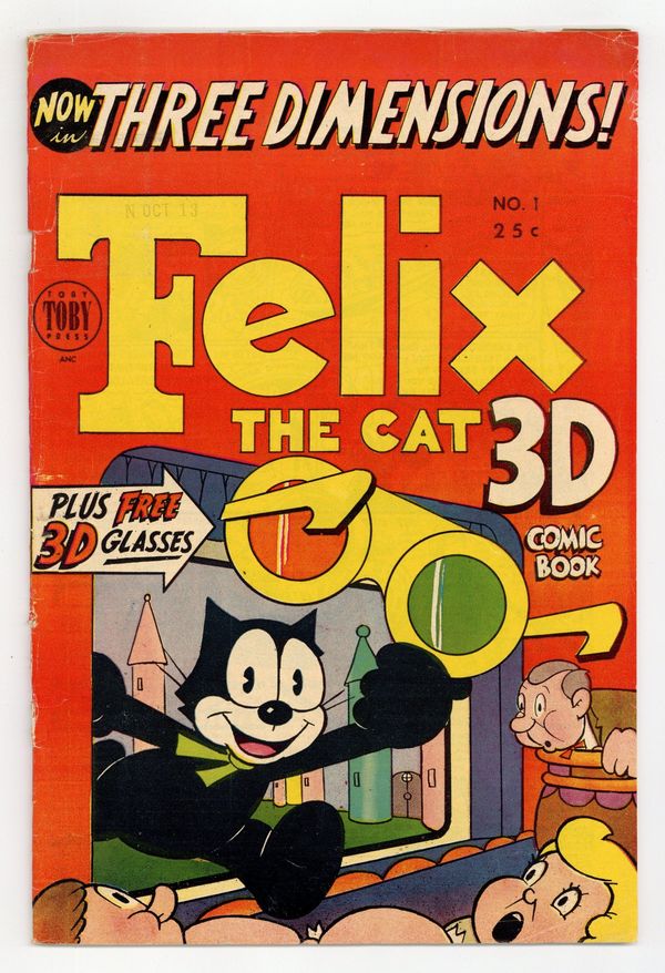 Does NOT include 3-D glasses. Cover by Otto Messmer. Stories and art by Otto Messmer and Joe Oriolo. Comics adventures of the popular, long-running cartoon character, printed in 3-D during the 1950s 3-D craze. Wanting to get away from it all, Felix takes his Magic Flying Carpet on a magical journey. Felix takes his plane to an exotic land, but is soon running for his life. Plus a vintage ad for "Vibra Planet Space Walkie-Talkies." What's New?; Giant Sighs; Zero Hero. 32 pages, B/W with 3-D effects. Cover price $0.25.