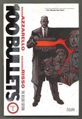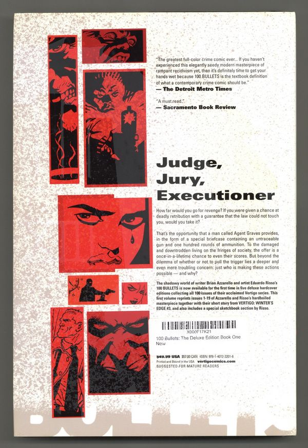 Volume 1 - 1st printing. Collects 100 Bullets (1999-2009) #1-19. Written by BRIAN AZZARELLO. Art by EDUARDO RISSO. Cover by DAVE JOHNSON. The first of five oversized, hardcover collections of the Eisner Award-winning 100 BULLETS collects the first nineteen issues of the crime series! In the opening chapters, Dizzy Cordova, a Latina gangbanger who has just finished a prison sentence, is given the chance to avenge her family's murders, and a downtrodden bartender receives the opportunity to exact revenge against the woman who ruined his life. Then, as Agent Graves continues to approach and manipulate his "clients," questions about the ghoulish agent start to arise as people from his past begin to appear, revealing interesting information about their former acquaintance. And in this volume's third arc, Graves pulls a young man by the name of Loop Hughes into his web of intrigue and deception. Armed with one of Graves's briefcases, Loop tracks down his long-lost father and is soon drawn into the world of mob enforcement. Hardcover, 7 1/2-in. x 11-in., 456 pages, full color. Mature Readers NOTE: "An ink-dark series about consequence-free revenge." - THE NEW YORK TIMES STYLE MAGAZINE "The story has it all: flawed protagonists, dirty cops, conspiracy, guns and that big mistake that makes it all go wrong." - THE CHICAGO TRIBUNE Cover price $49.99.