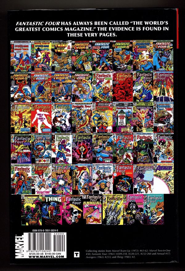 1st Edition - 1st printing. Collects Marvel Team-Up (1972-1985 1st Series) #61-62; Marvel Two-in-One (1974-1983 1st Series) #50; Fantastic Four (1961-1996 1st Series) #209-218, 220-221, and 232-260, ANNUAL #17; The Avengers (1963-1996 1st Series) #233; and Thing (1983-1986 1st Series) #2.