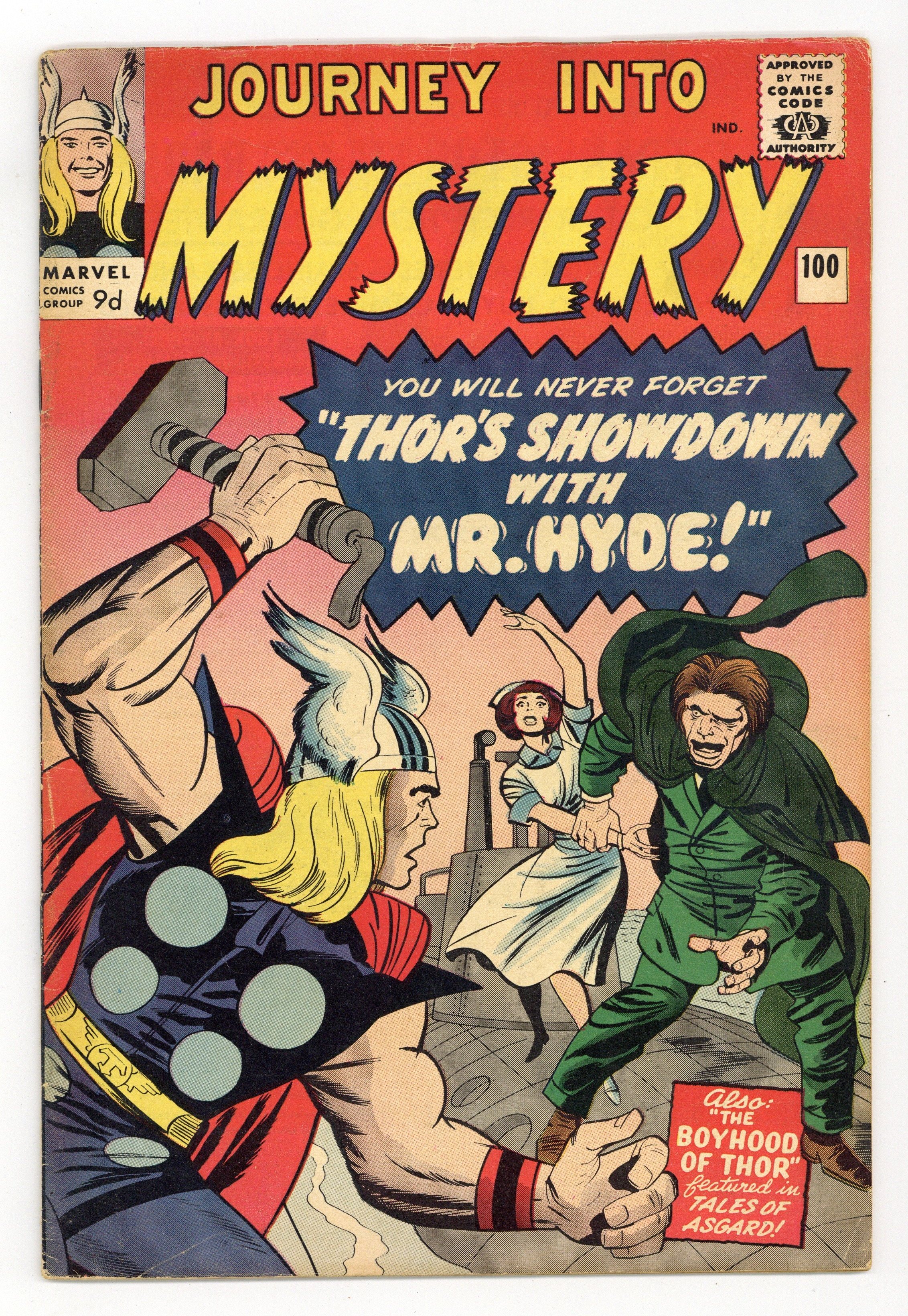 UK edition. Identical to US edition, but has 9d cover price. Mr. Hyde is still causing trouble in "The Master Plan of Mr. Hyde!" Script by Stan Lee, art by Don Heck. Jane Foster and Odin appearances. Fourth "Tales of Asgard" installment, "The Storm Giants!" Script by Lee, pencils by Jack Kirby, inks by Paul Reinman. This is the first "Boyhood of Thor" story; features young Thor and Loki. Other back-up stories: "The Unreal" with plot by Lee, script and pencils by Larry Lieber, inks by Matt Fox; and a two-page text story, "Tricky Travel." Kirby/George Roussos cover.