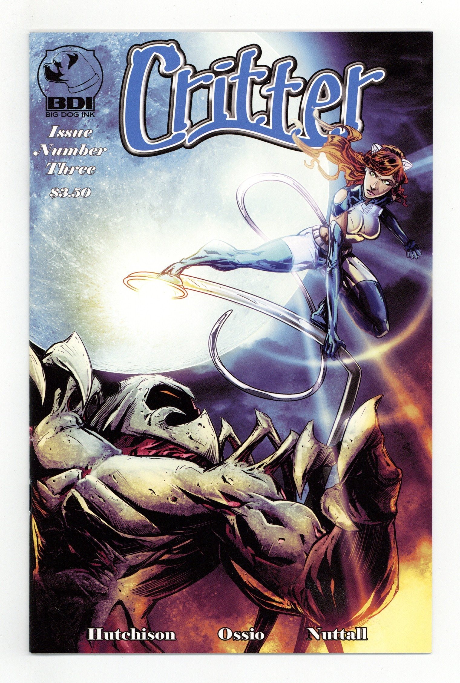 Published Sep 2011 by Big Dog Ink.$16.00Cover by Fico Ossio (W) Tom Hutchison (A) Fico Ossio Monsters, Mayhem and Mascara! Critter has her hands full with an invasion from the ocean depths while also being tracked down by her insane self-declared arch enemy, Mascara. And who's that whispering in Critter's ear? Cover price $3.50.