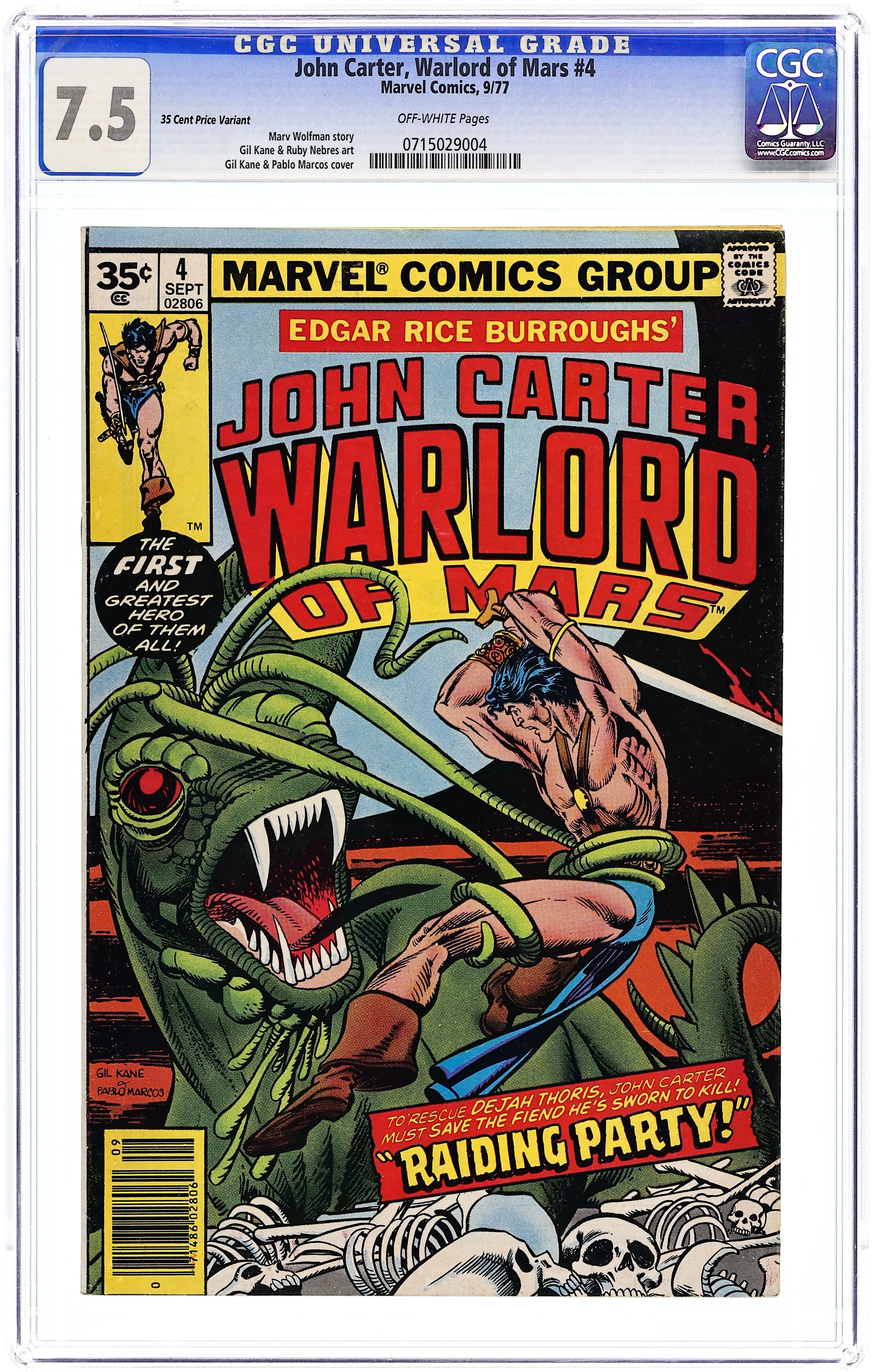 Limited Distribution 35 Cent Price Variant. "Air Pirates of Mars, Part 4: Raiding Party." Stara Kan puts John Carter in a difficult position by telling him that he must join in a raid or watch Dejah Thoris die. Script by Marv Wolfman, pencils by Gil Kane, inks by Rudy Nebres. Cover by Kane and Pablo Marcos. Cover price $0.35.