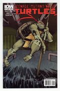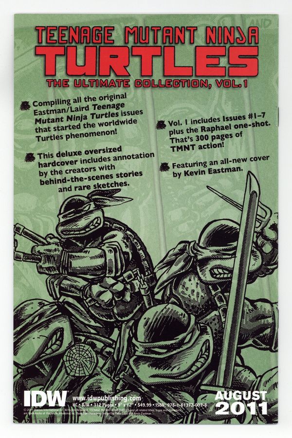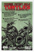 Published Aug 2011 by IDW Publishing.$70.00Cover B by Dan Duncan. Kevin Eastman, Tom Waltz (w) o Dan Duncan (a) Sam Kieth, Duncan x 4 (c) They're BACK! This summer, the original heroes in a half-shell make a triumphant return to comics! Leonardo, Donatello, Michaelangelo, and Raphael reunite to bring their ninja aptitude and teenage attitude to IDW Publishing in this all-new, action-packed series. Featuring a cast of familiar characters-Master Splinter, April O'Neill, Casey Jones, and more-and true to the spirit of the original comics created by Kevin Eastman and Peter Laird, the TEENAGE MUTANT NINJA TURTLES are bigger and badder than ever, and ready to rock old and new fans alike! Cover price $3.99.