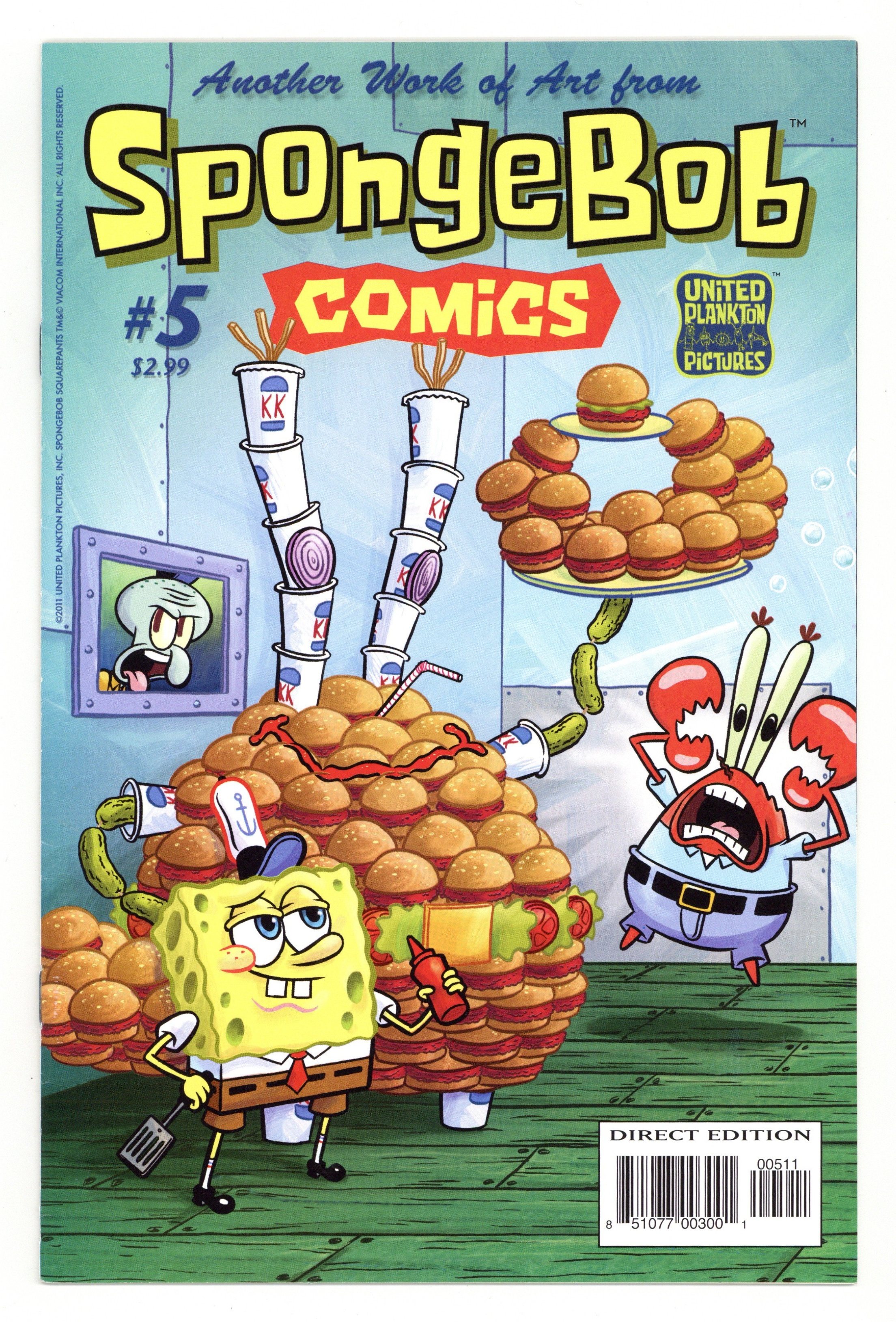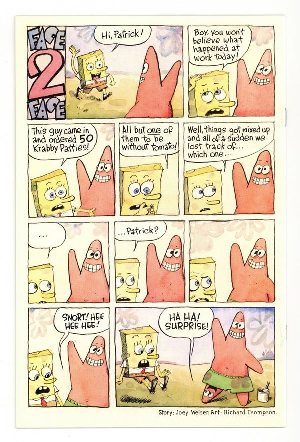 Published Oct 2011 by United Plankton Pictures.$70.00(W/A) Chuck Dixon, Stephen DeStefano, Derek Drymon, Gregg Schigiel, Various In 'Day Off/Off Day,' The Krusty Krab is under siege by SpongeBob! Krabs must keep the humble fry cook from entering the restaurant or (horrors!) face a modest fine for working his employees too hard. But a determined SpongeBob can get through any defenses that Krabs concocts. How far will Krabs go to keep him out? Also, Patrick and SpongeBob face the open road in big rigs. All this plus a pin-up, a choose-your-path comic of Squidward's nightmares, a page of aquatic facts, and a knockout back cover written by Joey Weiser! Cover price $2.99.