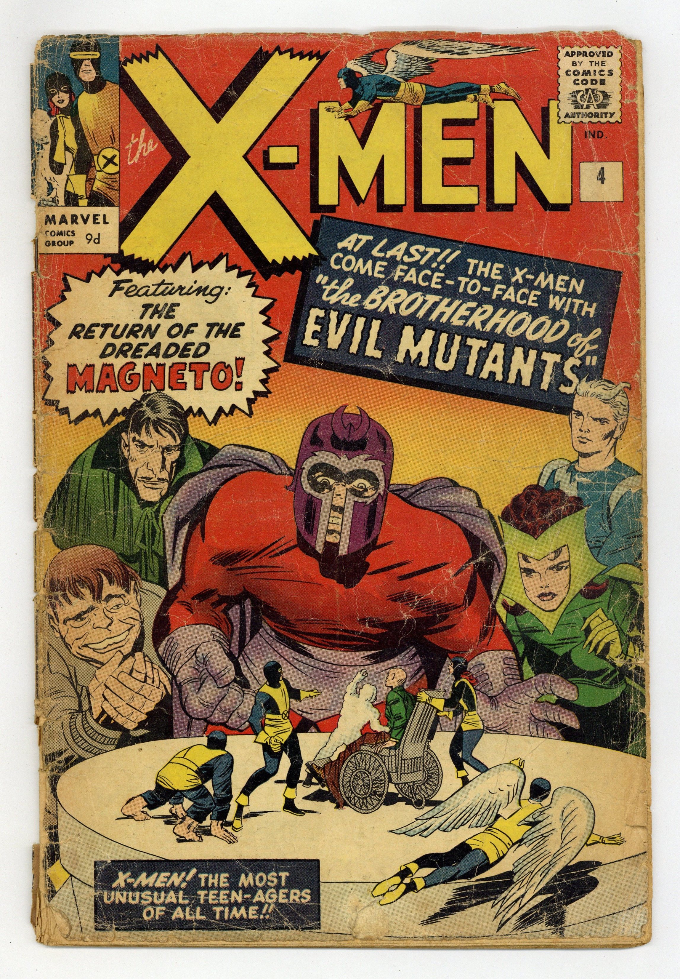 UK edition. Identical to US edition, but has 9d cover price. Quicksilver, Scarlet Witch, Mastermind, and Toad appear for the 1st time, and Magneto makes his 2nd appearance. Cover pencils by Jack Kirby. The Brotherhood of Evil Mutants!, script by Stan Lee, pencils by Jack Kirby, inks by Paul Reinman; Magneto and his new Brotherhood of Evil Mutants steals a freighter and uses it to take over the South American nation of Santo Marco; The X-Men invade and take the country back; Xavier is caught in an explosion and loses his mental powers.