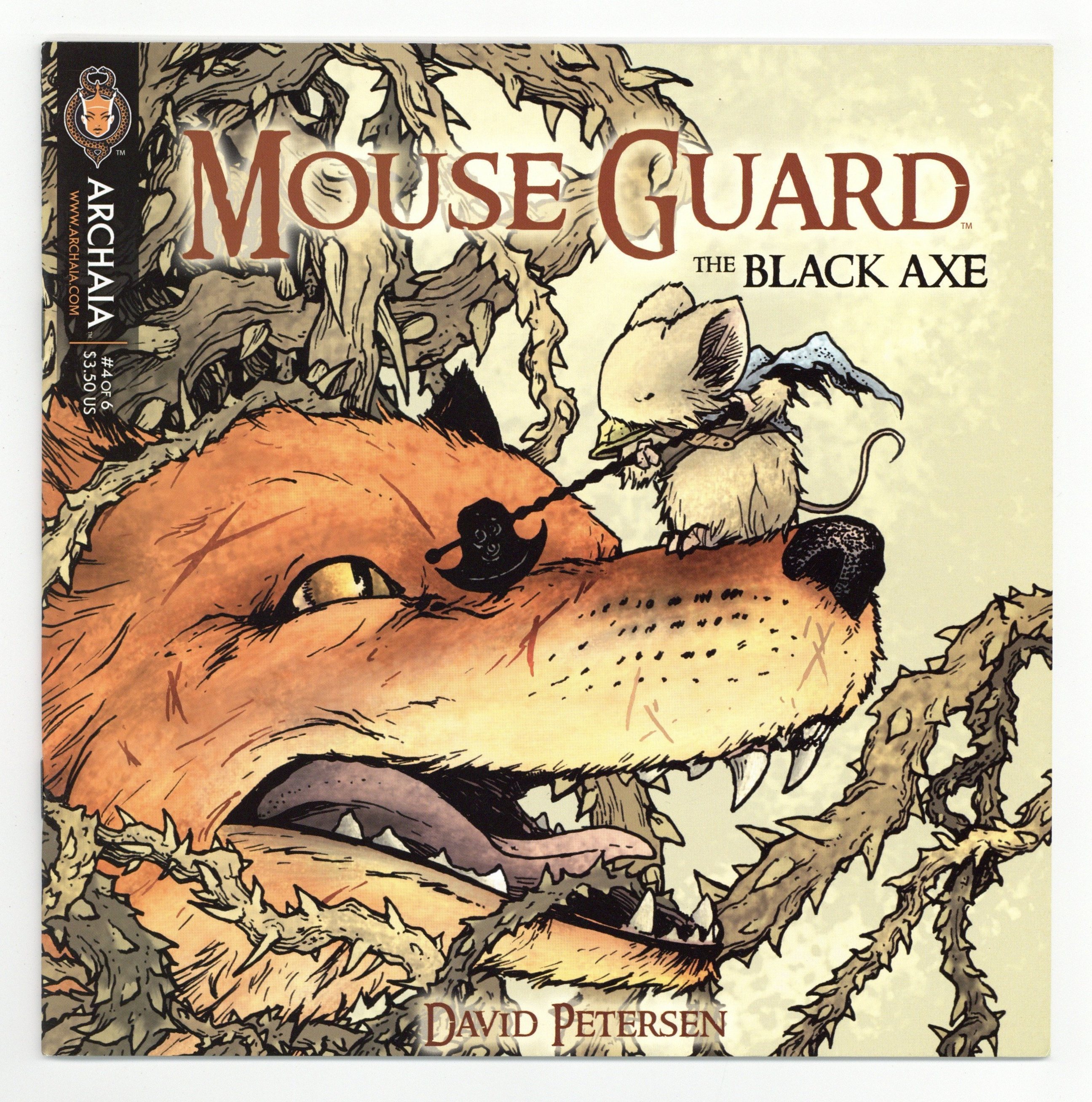Published Jan 2012 by Archaia Studios Press.$12.00Leaving the fate of Em in the weasel king of Ilder's paws, Celanawe trudges into the briar lair of a murderous fox. The Black Axe, a weapon forged by Farrer and now wielded by his youngest heir, is put to the test so that one lone mouse can slay the red-furred villain which has claimed enough ferret lives to have the king of Ildur afraid to send his own kin after it. The uneven brutal battle has an only more brutal end. Cover price $3.50.
