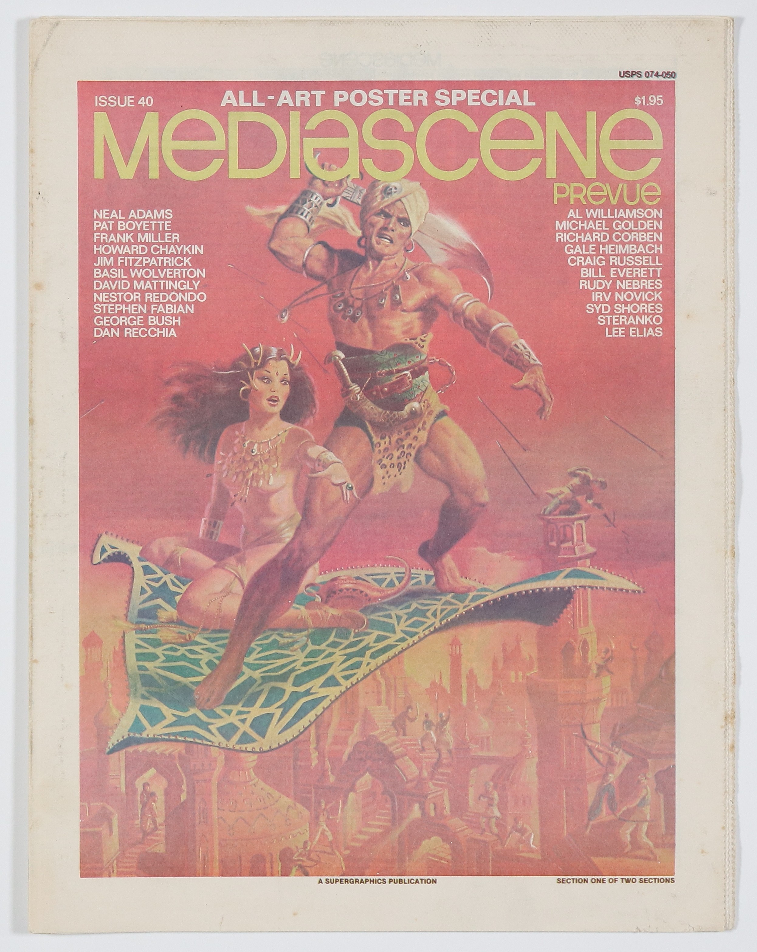 Published 1979 by Supergraphics.$29.00Jim Steranko's fine zine covering popular entertainment. Tabloid newspaper format (all issues come folded) but on good quality white paper stock. All art poster special featuring Neal Adams, Frank Miller, Steranko, Al Williamson, Michael Golden, Richard Corben, Howard Chaykin, Craig Russell, Bill Everett, Shores, Rudy Nebres, and more. Cover price $1.95.