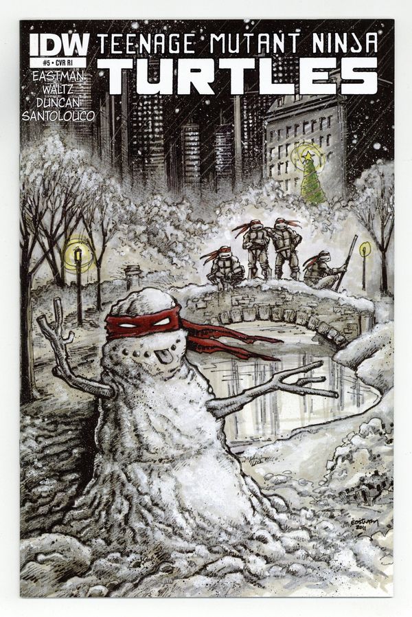 Limited 1 for 10 Variant Cover by Kevin Eastman. The Turtles are reunited, although distance still remains between the brothers. Fortunately nothing brings people together like the holiday season! It's Christmas in New York City, and the aftermath of the battle with Old Hob allows for more mysteries to be revealed... and new dangers to be uncovered. The Teenage Mutant Ninja Turtles begin their journey as a true team of brothers in this exciting issue! Cover price $3.99.