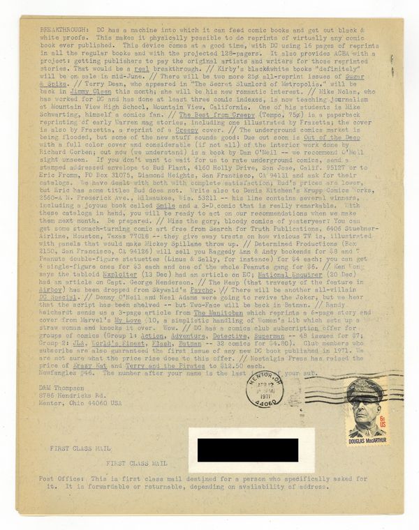 News zine published by Don and Maggie Thompson. Circulation 535. Cover price $0.20.