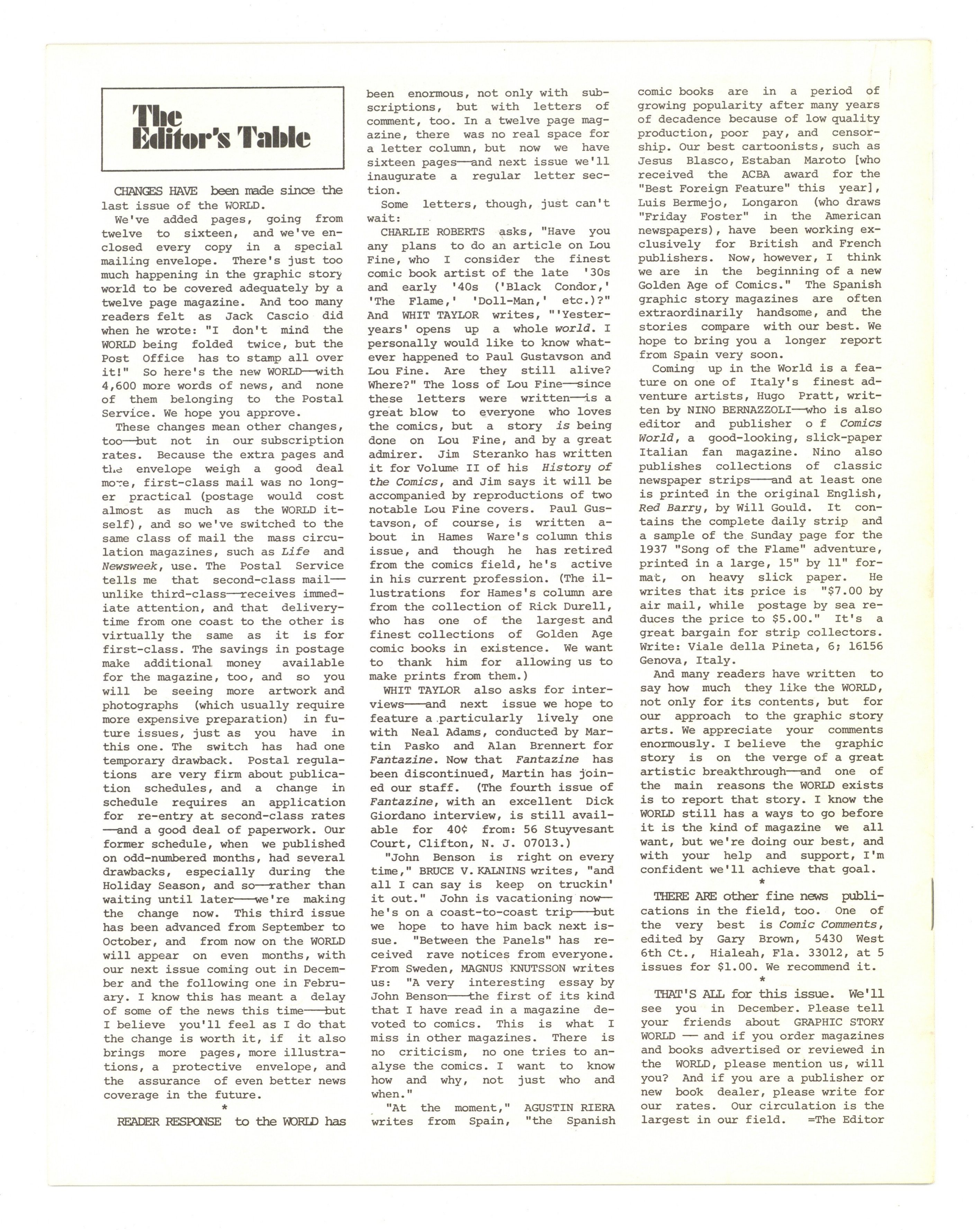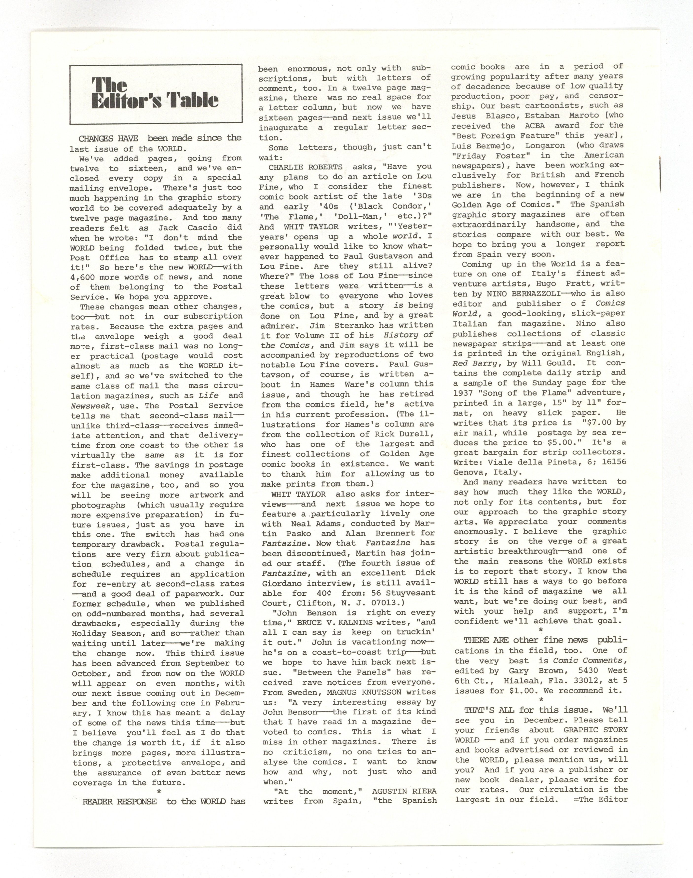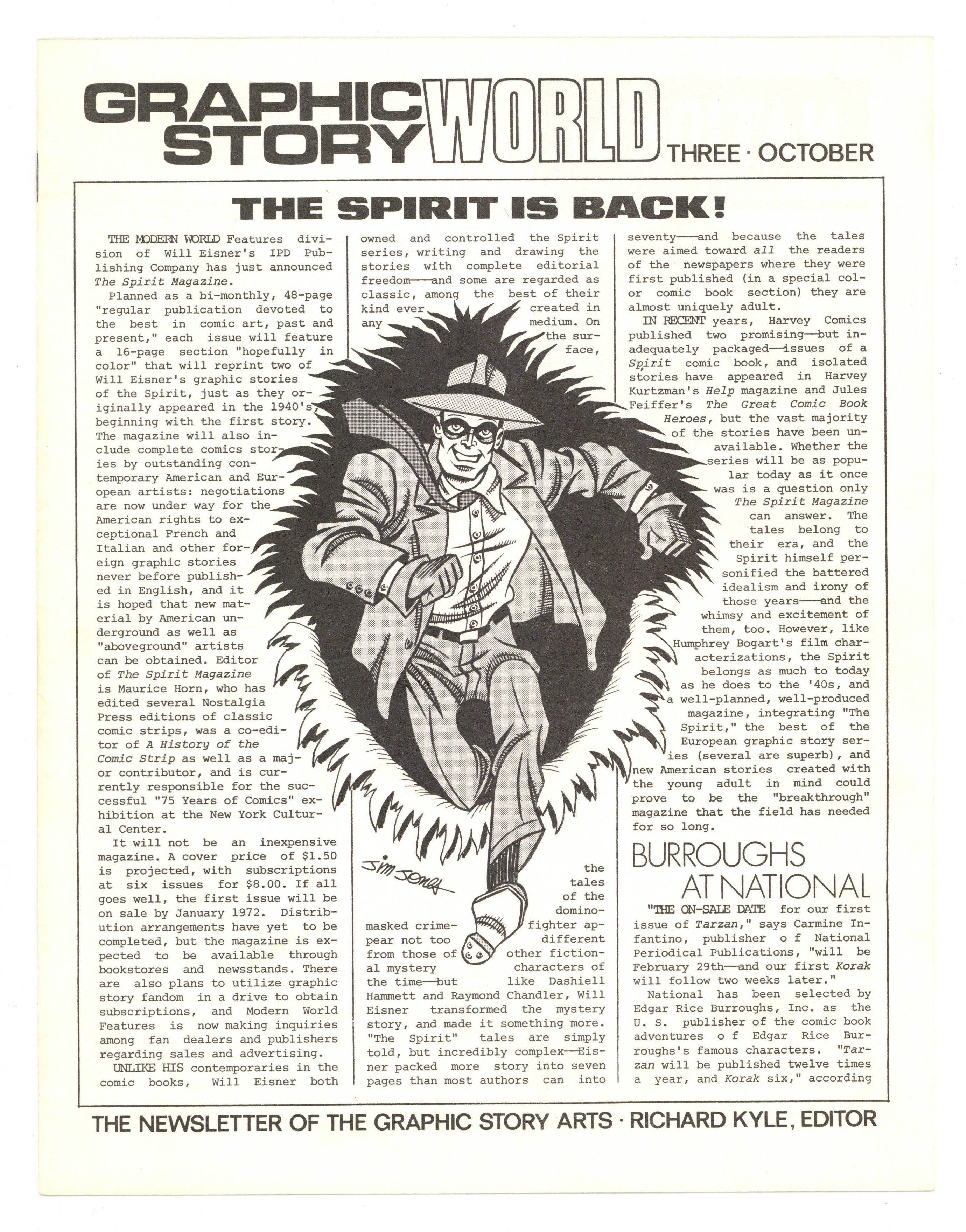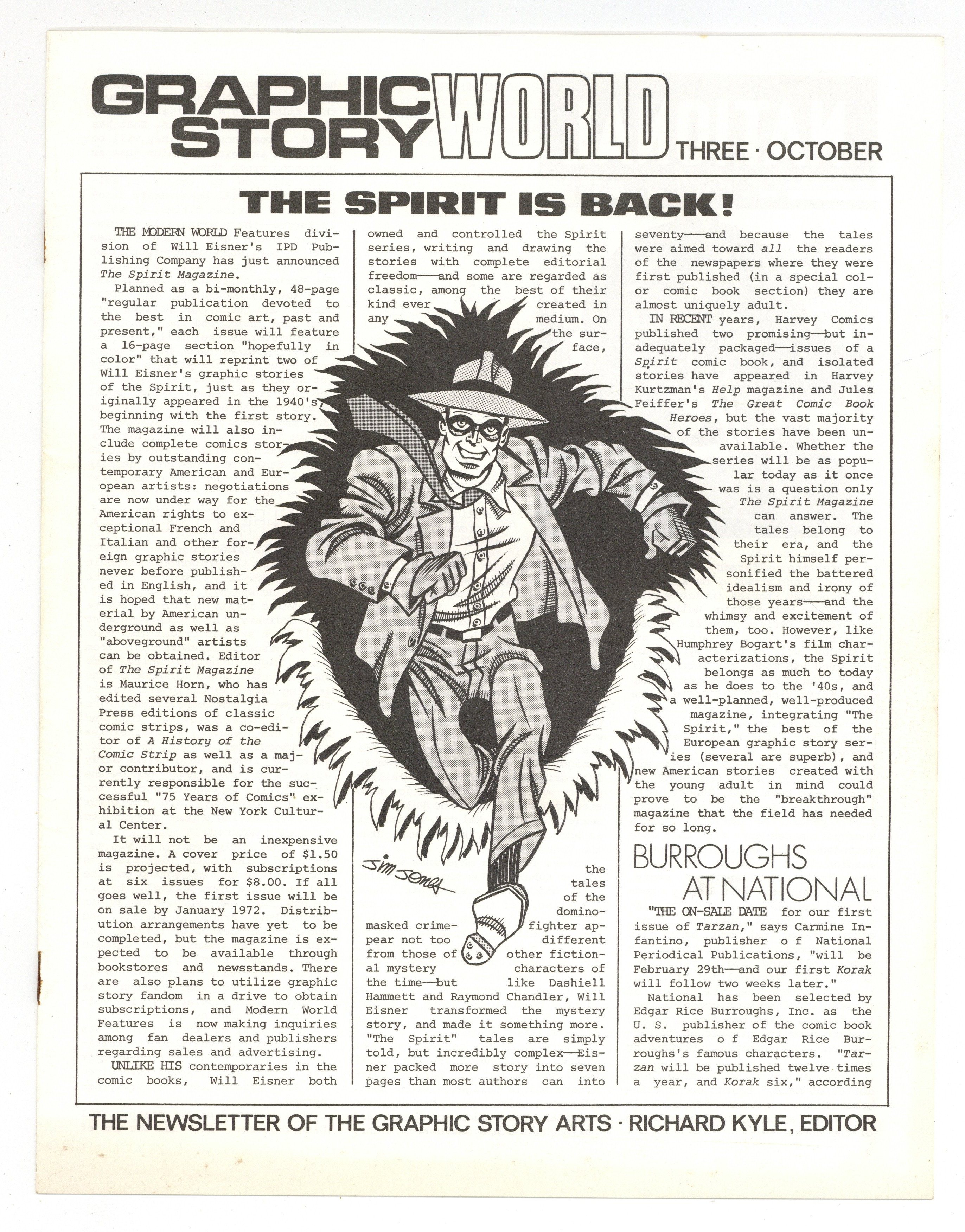 $11.00October 1971. Volume 1, Number 3. Graphic Story World is a newsletter edited by Richard Kyle covering the entire spectrum of graphic arts: Underground Comix, Comic Books, Animated Films, Books, & more. This issue: Articles on the Spirit Magazine, Asterix, and lots more. 8 1/2" x 11"; black and white; 16 pages. Cover price $0.40.