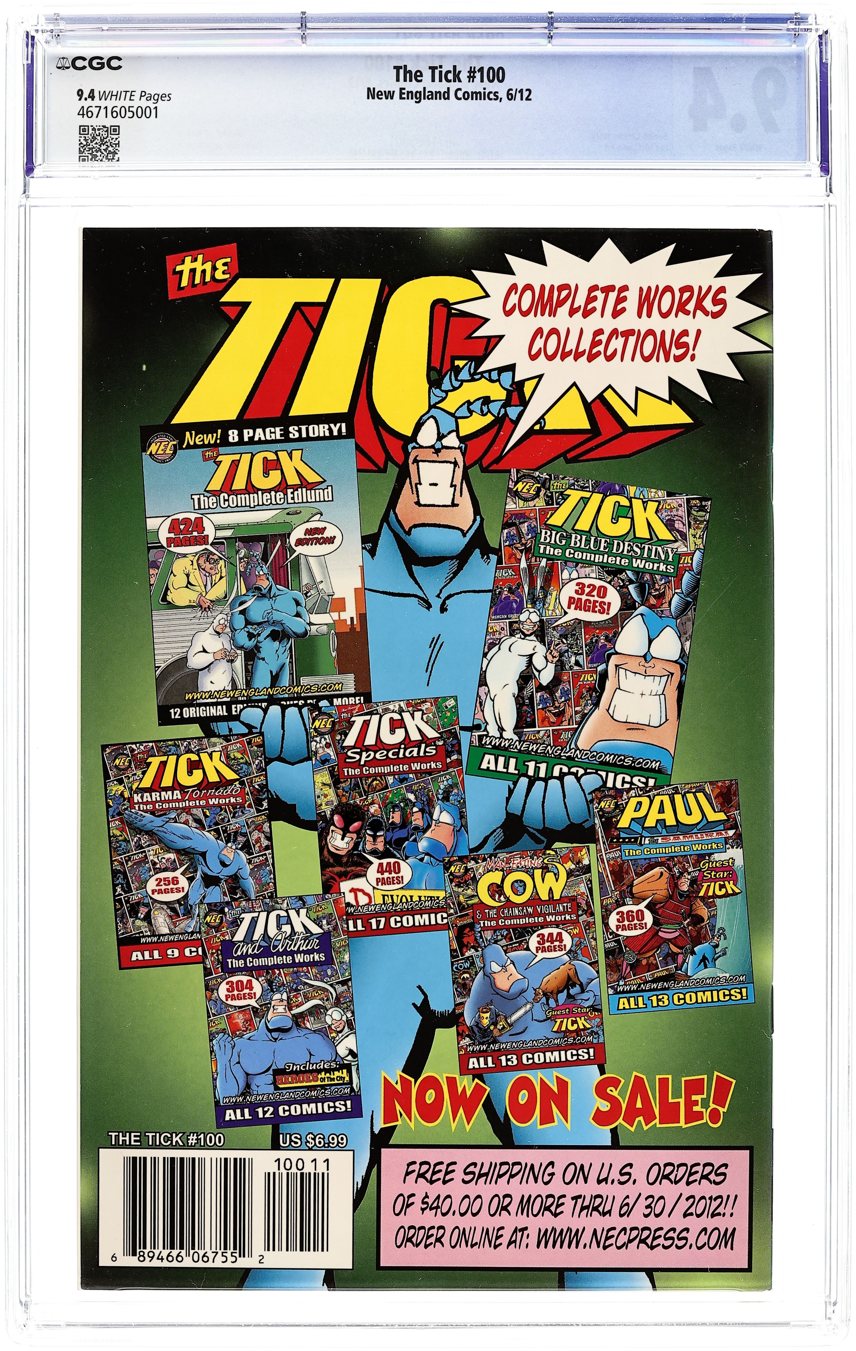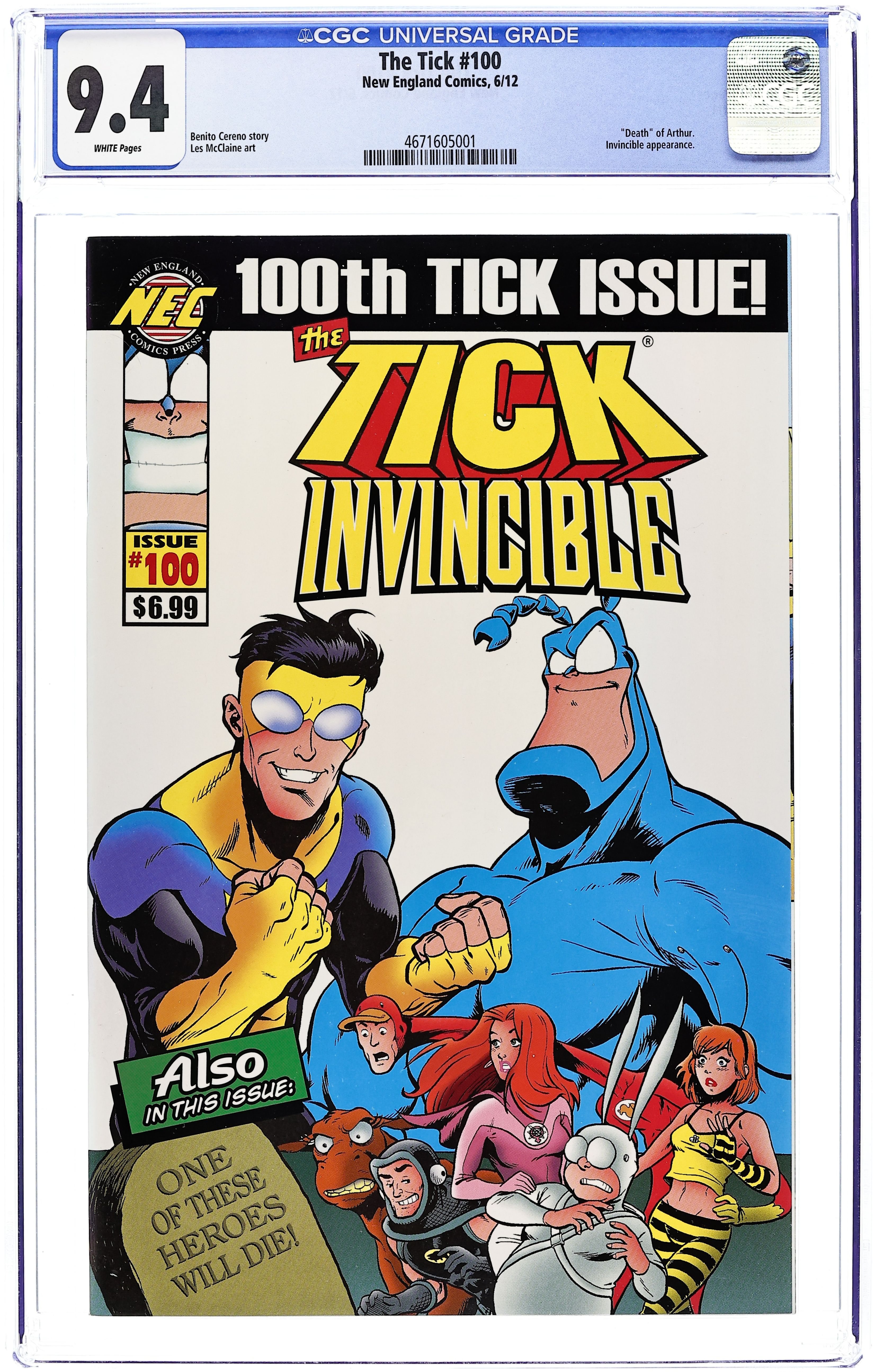 (W) Benito Cereno (A/CA) Les McClaine Celebrate the 100th issue of The Tick with a 48-page full-color blockbuster co-starring Robert Kirkman's Invincible! In a full-length 24-page epic, Invincible is transported to The Tick's universe where the two mighty heroes confront the combined threat of the master criminal Chairface Chippendale and a mysterious and menacing new villain who makes even Chairface look like an ordinary umbrella stand! A story so awesome it requires two planets and at least one moon to contain it! Added bonus, 'The Story of The Tick,' a 20-page full-color history of The Tick's illustrious career! Cover price $6.99.