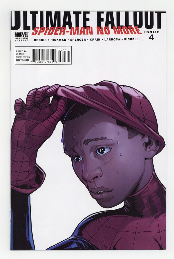 Tags: Spider-Man$41.00Second printing, Sarah Pichelli variant cover. Written by BRIAN BENDIS, JONATHAN HICKMAN & NICK SPENCER. Art by SARA PICHELLI, SALVADOR LARROCA & CLAYTON CRAIN. What will become of Captain America? Where have all the X-Men gone? And what is up with the new Spider-Man suit? Don't miss the final chapters of one of the most talked about Ultimate events ever. 32 PGS. (each)/Rated T+...$3.99 (each) Cover price $3.99.