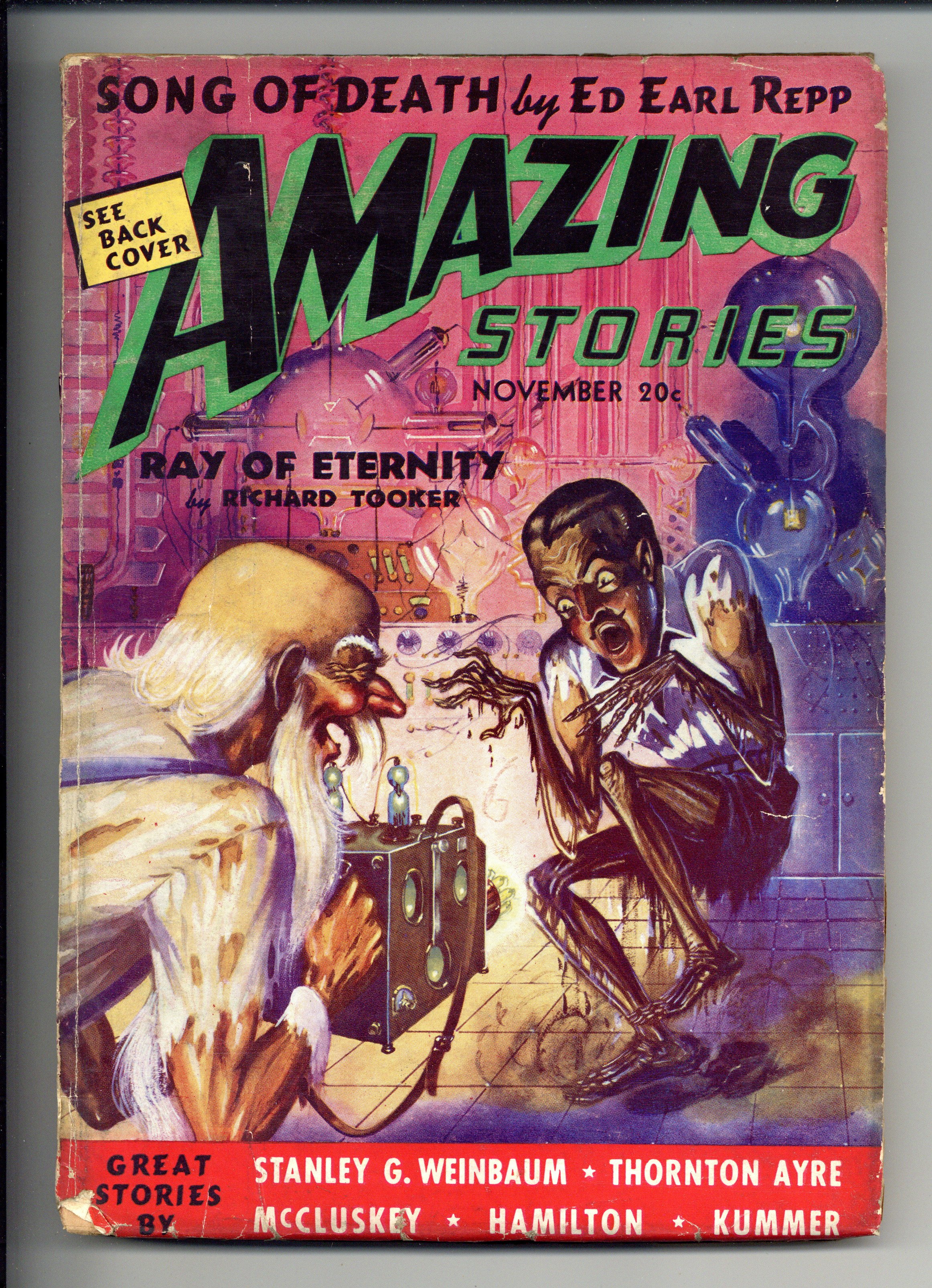 Volume 12, Issue 6 - November, 1938. Cover by Robert Fuqua, depicting a scene in "Ray of Eternity" by Richard Tooker. Stories by Richard Tooker, Ed Earl Repp, Thorp McClusky, Stanley G. Weinbaum, Edmond Hamilton, Frederic Arnold Kummer, Jr. and Thornton Ayre. Illustrations by Julian S. Krupa and Robert Fuqua. Stories: "Ray of Eternity" by Richard Tooker - Death cut a grim swath across the blasted valley of Eli Martin, making it a tomb of mummies; "Song of Death" by Ed Earl Repp - Like puppets he could make men march, controlled by the super-sonic vibrations of his machine; "Monstrosity of Evolution" by Thorp McClusky - He found the secret of cosmic radiation, and monstrous was the product of his evolution; "Revolution of 1950" (conclusion) by Stanley G. Weinbaum - Revolt flamed across America, and he had to double-cross both sides to save the President; "The Man Who Lived Twice" by Edmond Hamilton - He found himself trapped in the laboratory of an unscrupulous scientist -- and centuries passed; "Pirates of Eros" by Frederic Arnold Kummer, Jr. - Stripped of his command by a ghastly accident in space, he became a ray-tender on lonely Eros; and "The Secret of the Ring" by Thornton Ayre - Elemental fury lashed at the foundations of civilization, and destiny lay in a jeweled ring. Features: The Observatory; Riddles of Science; Science Quiz; Discussions; Questions & Answers; Meet the Authors; Stratosphere Airliner of 1988; and Correspondence Corner. 7-in. x 10-in., 144 newsprint pages, B&W. Cover price $0.20.