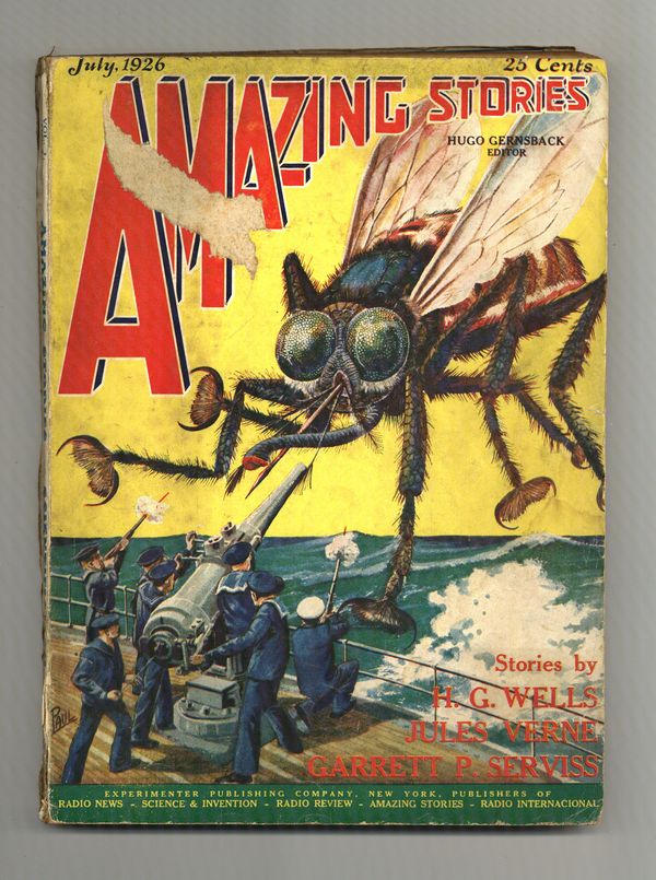 July 1926. Frank Paul cover for "The Eggs from Lake Tanganyika" by Curt Siodmak. Stories by H. G. Wells ("The Man Who Could Work Miracles"), Jules Verne ("A Trip to the Center of the Earth") and Garrett P. Serviss ("The Moon Metal"), and more. Edited by Hugo Gernsback. 8-in. x 11-in.; black and white with color cover; 96 newsprint pages. Cover price $0.25.
