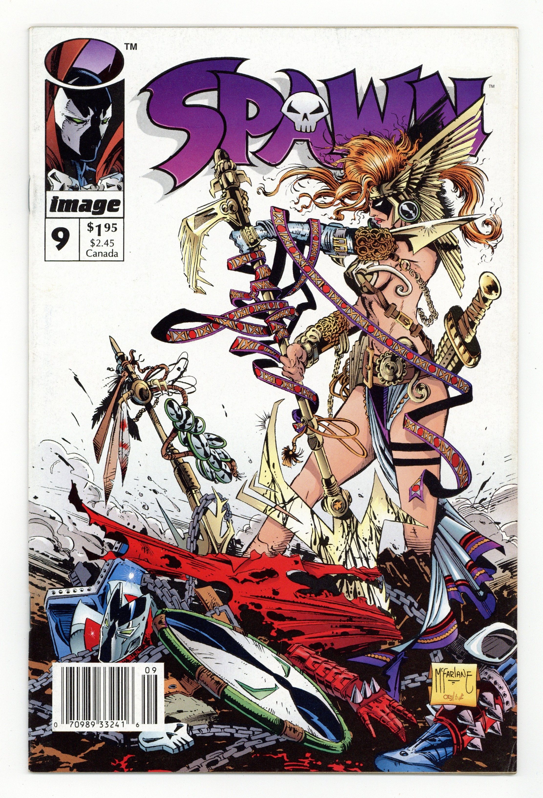Newsstand Edition. "Angela!" 1st appearance of Angela, Cagliostro, and Medieval Spawn. Story by Neil Gaiman. Art by Todd McFarlane. Spawn is attacked by Angela, a warrior of Heaven who has been hunting Hellspawns for centuries. Includes a B&W poster of Angela by Jim Lee and Todd McFarlane. Cover price $1.95.