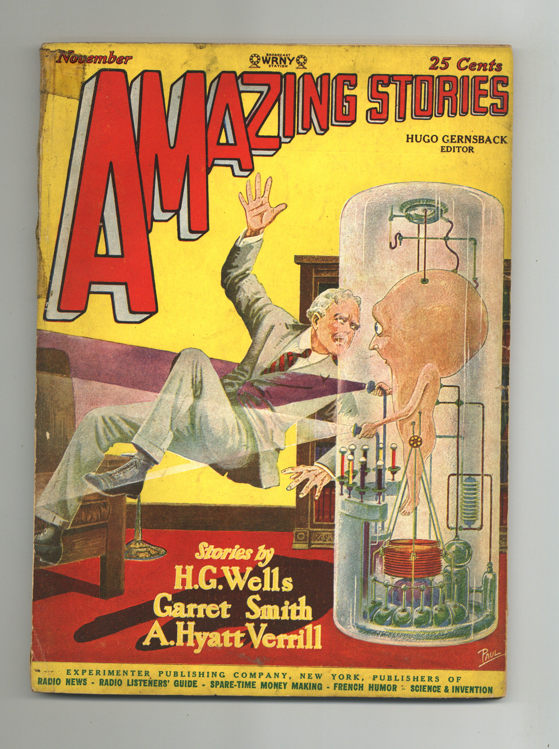 November 1927. Front cover art by Frank R. Paul. Stories by H.G. Wells ("A Story of the Stone Age"), Garrett Smith, A. Hyatt Verrill, and George Henry Weiss (who wrote sci-fi under the pseudonym Francis Flagg). Edited by Hugo Gernsback. 8-in. x 11-in.; black and white with color cover; 96 newsprint pages. Cover price $0.25.