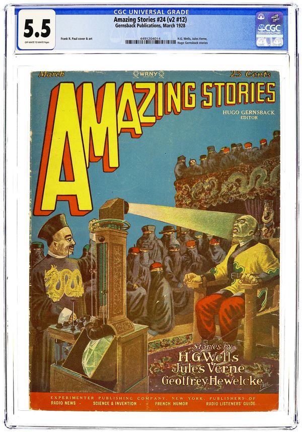 March 1928. Cover art by Frank R. Paul, from "Lakh-Dal, Destroyer of Souls" by W.F. Hammond. Stories by H. G. Wells ("The Flowering of the Strange Orchid"), Jules Verne ("The Master of the World" part 2), Hugo Gernsback ("Baron Munchhausen's Scientific Adventures"), and more. Edited by Hugo Gernsback. 8" x 11"; black and white with color cover. Cover price $0.25.