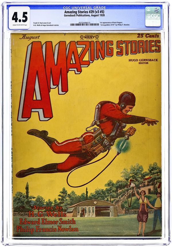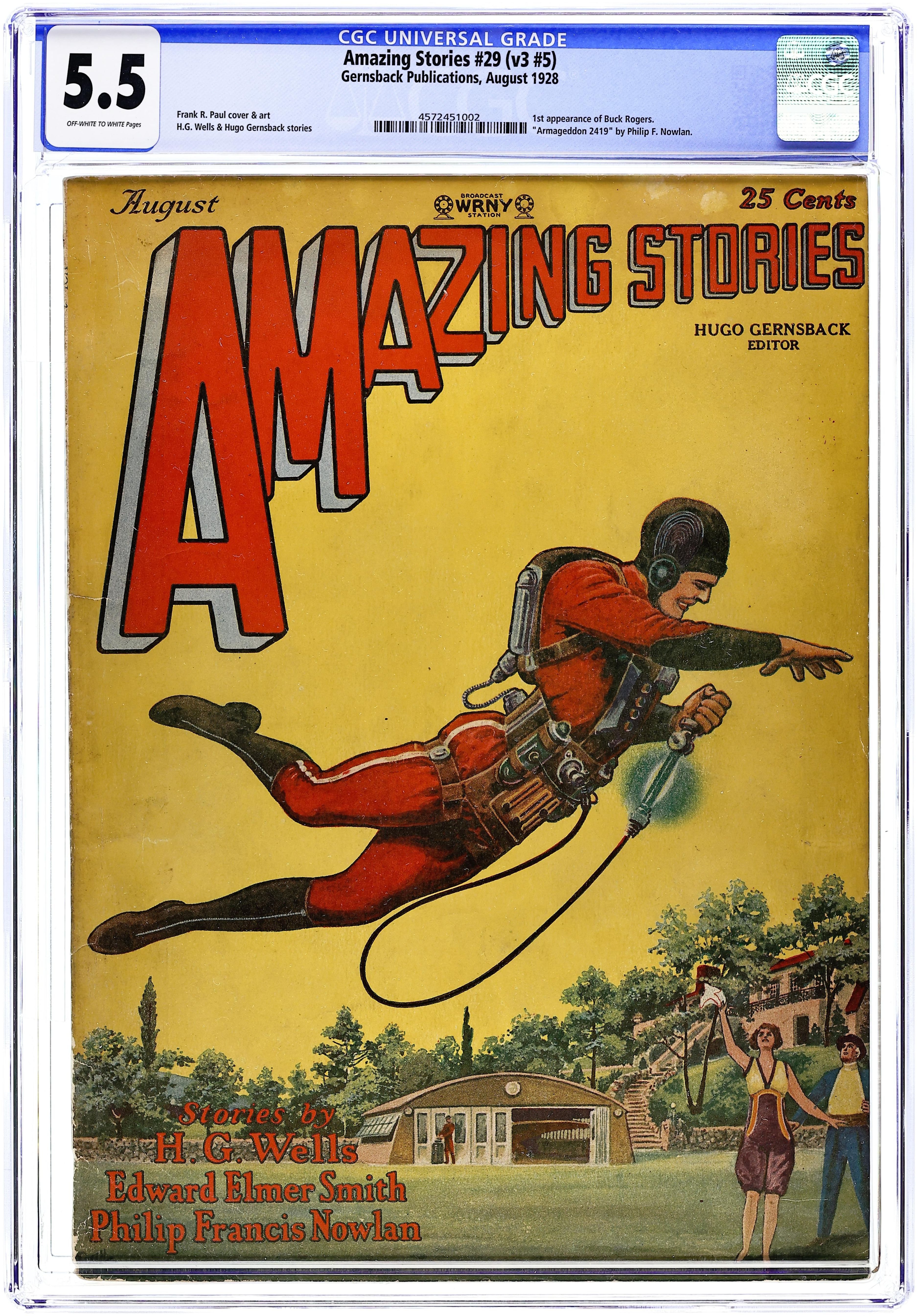 August 1928. Cover art by Frank R. Paul, from "The Skylark of Space" by Edward Elmer "Doc" Smith (his 1st published work). Stories include H. G. Wells, "The Moth"; Philip Francis Nowlan, "Armageddon 2419" which contains the first appearance in any format of Buck Rogers; and more. Edited by Hugo Gernsback. 8" x 11"; black and white with color cover. Cover price $0.25.