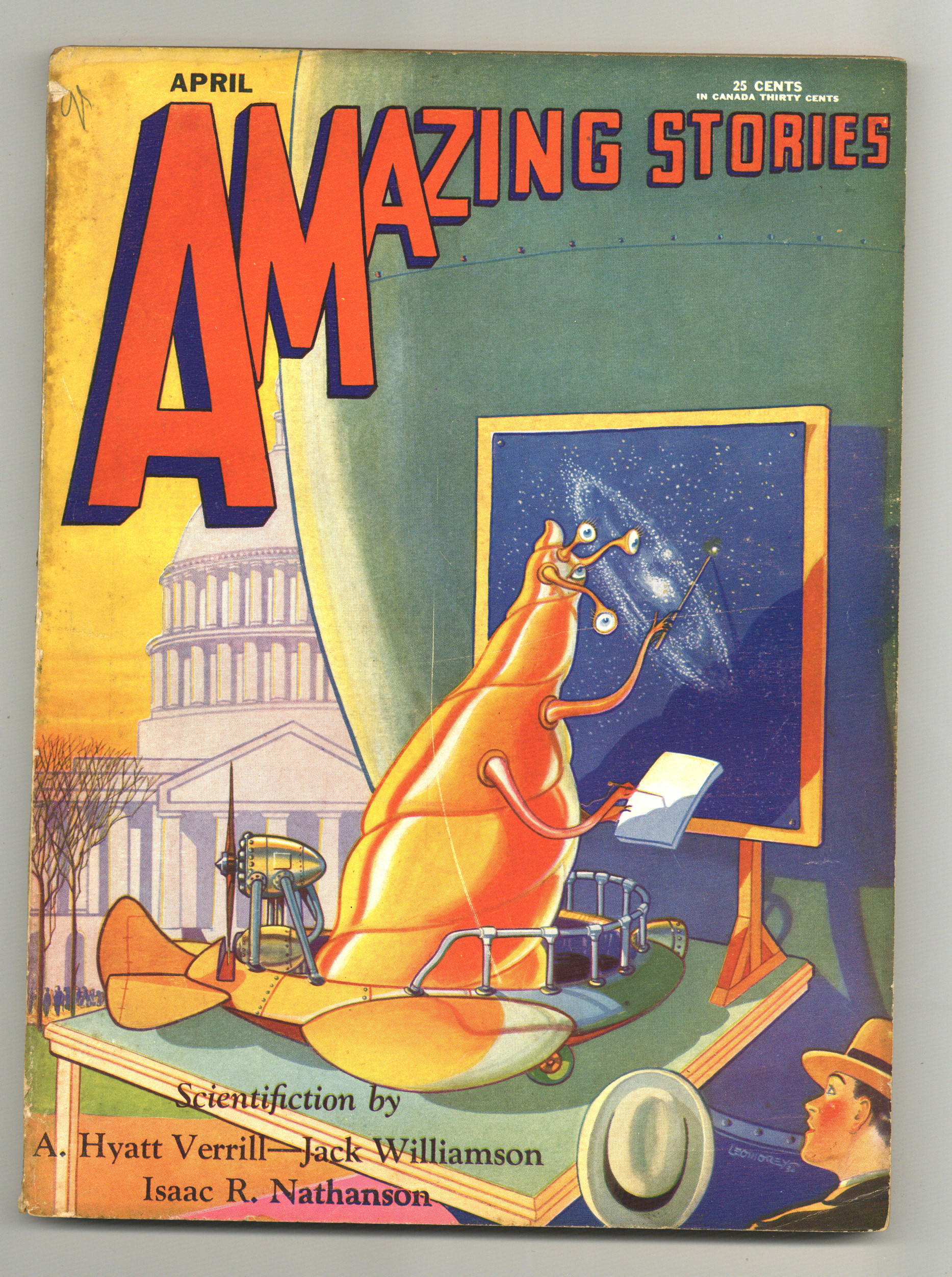 Amazing Stories volume 5 number 1 published in April 1930. This issue features front cover art from "The Conquest of the Earth" by Isaac R. Nathanson. Special writers include A. Hyatt Verrill ("The Feathered Detective"), Jack Williamson ("The Green Girl" part 2), John W. Campbell, Jr ("The Metal Horde"), and more. Edited by Hugo Gernsback. 8-in. x 11-in.; black and white. Cover price $0.25.