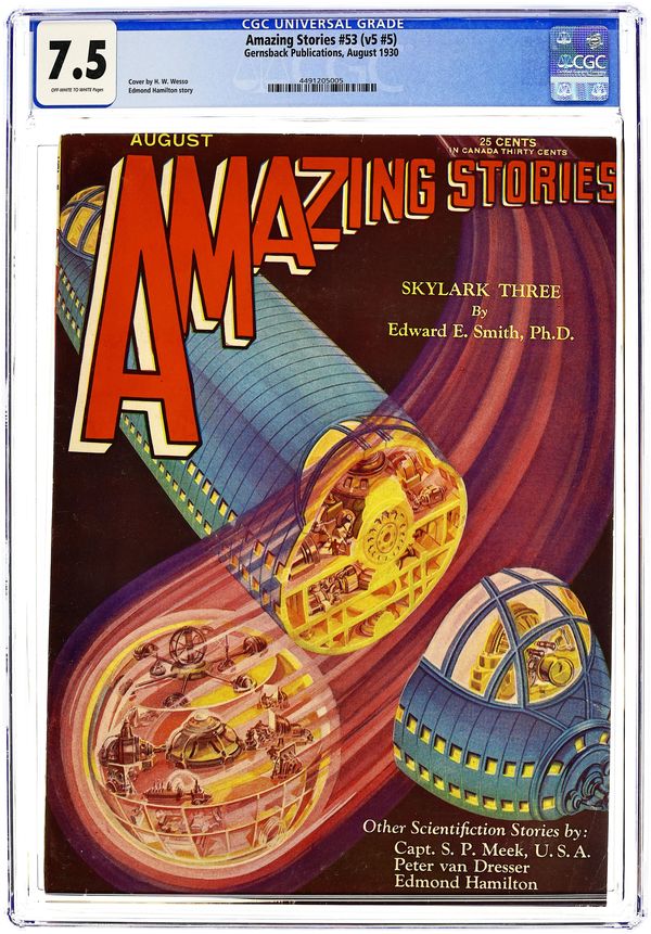 August 1930. Amazing Stories is an American science fiction magazine launched in April 1926 by Hugo Gernsback's Experimenter Publishing. It was the first magazine devoted solely to science fiction. Featuring stories by Edward E. Smith, Peter Van Dresser, Edmond Hamilton, and more! 8 1/2-in x 11 1/2-in, 100 pgs, B&W. Cover price $0.25.