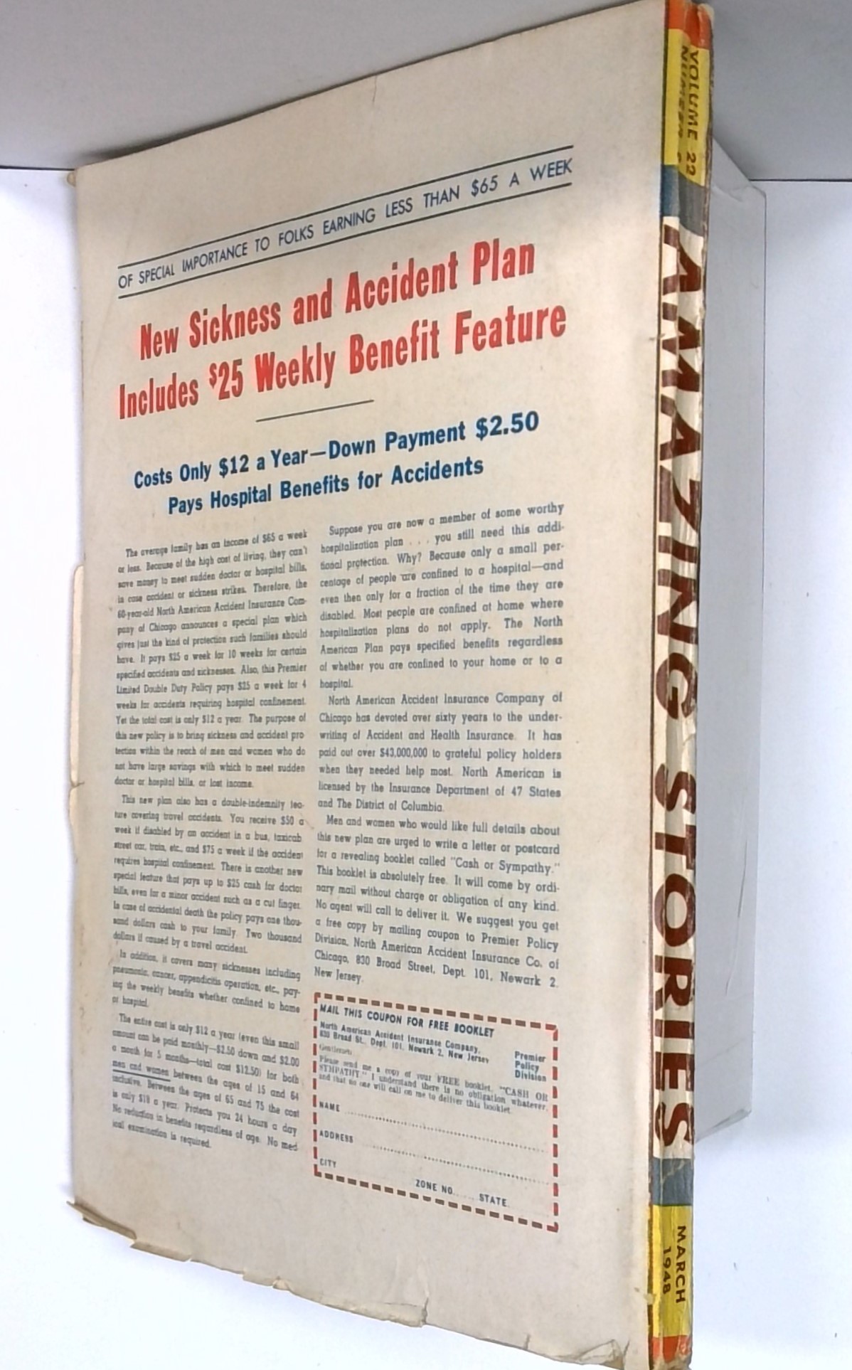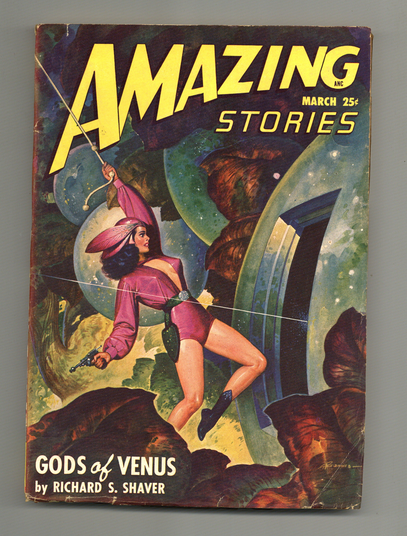 Volume 22, Issue 3 - March, 1948. Cover by Robert Gibson Jones. Stories by Richard S. Shaver ("Gods of Venus"), Millen Cooke, Berkeley Livingston, and Alexander Blade. Illustrations by Rod Ruth, Robert Fuqua, and H.W. McCauley. 7" x 10"; black and white with color cover; 182 newsprint pages. Cover price $0.25.