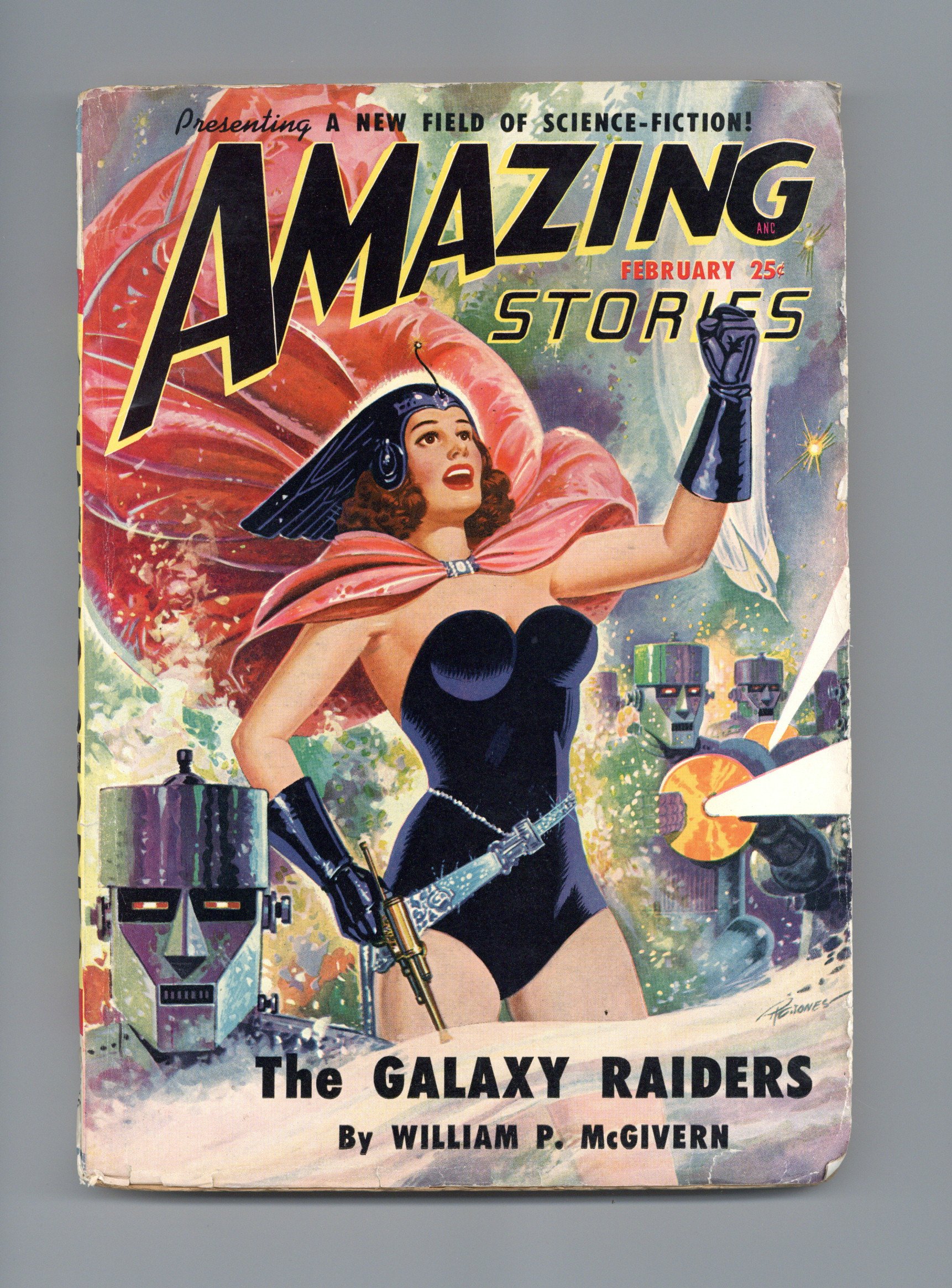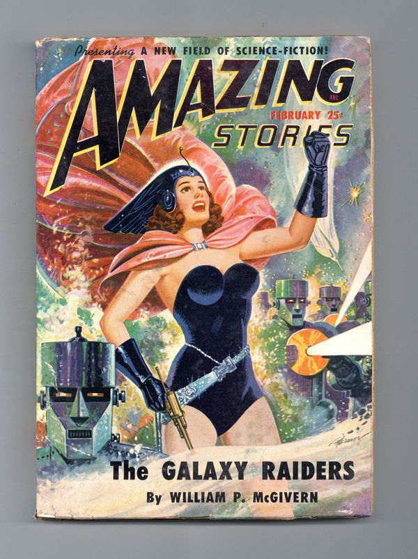 Feb 1950. Cover by Robert Gibson Jones. 1st published SF by Paul W. Fairman "No Teeth for the Tiger". Other science fiction stories by William P. McGivern "The Galaxy Raiders", Peter Worth, Charles Dye, , V.E. Thiessen, Henry Haase, Rog Phillips, and Russell Storm. Illustrations by Leo Ramon Summers, Edmond Swiatek, Walter Hinton, Julian S. Krupa, and Bill Terry. 7-in. x 10-in.; black and white; 164 newsprint pages. Cover price $0.25.