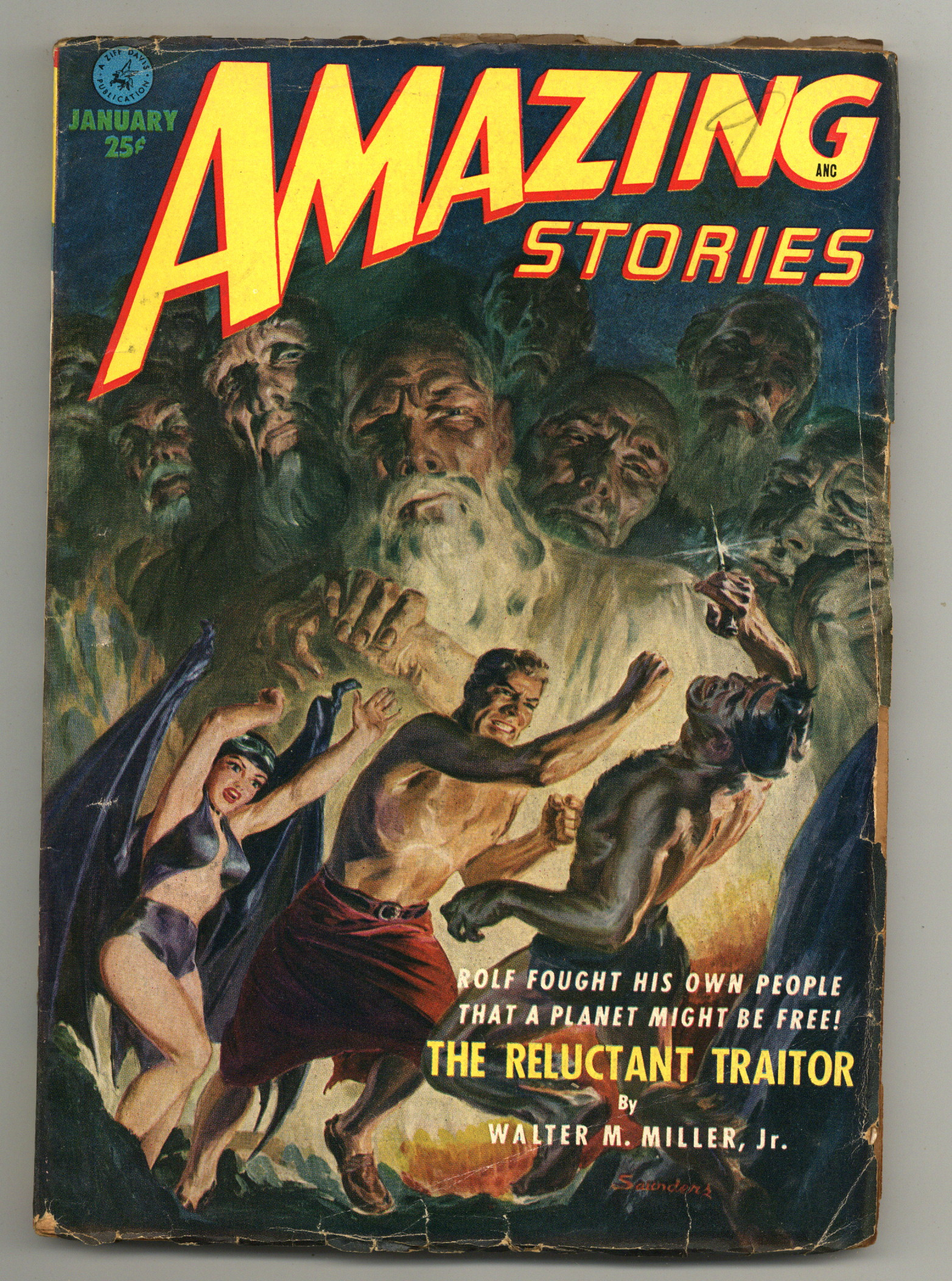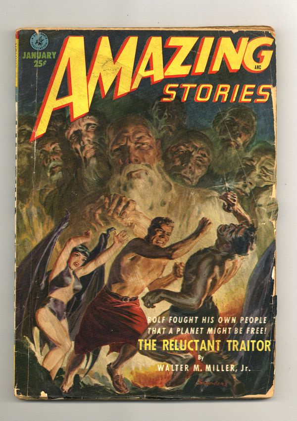Jan 1952. Cover by Norman Saunders. Science fiction stories by Walter M. Miller Jr., Stephen Marlowe, Gerald Vance, Milton Lesser, and Rog Phillips. Illustrations by James Otis, Ed Emsler, Gene Fawcette, Ed Valigursky, and Julian S. Krupa. 7-in. x 10-in.; black and white; 162 newsprint pages. Cover price $0.25.