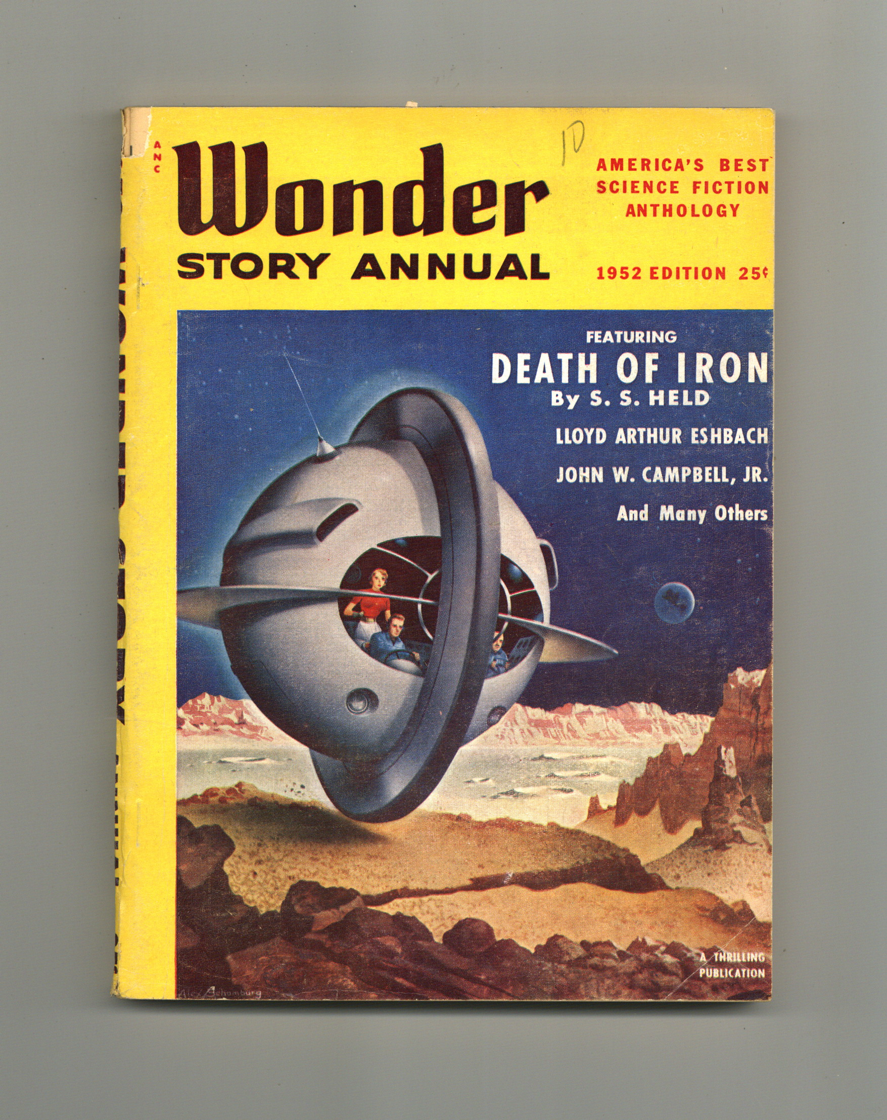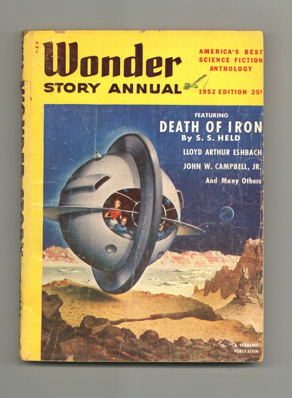 Giant-size issue featuring stories by S.S. Held, Lloyd Arthur Eshbach, John W. Campbell Jr., Arthur Leo Zagat, Paul Ernst, E. Everett Evans, Oliver E. Saari, and Gabriel Wilson. Virgil Finlay (3) and Alex Schomburg illustrations. 6-1/2 in. x 9-3/8 in.; black and white; 162 newsprint pages. Cover price $0.25.