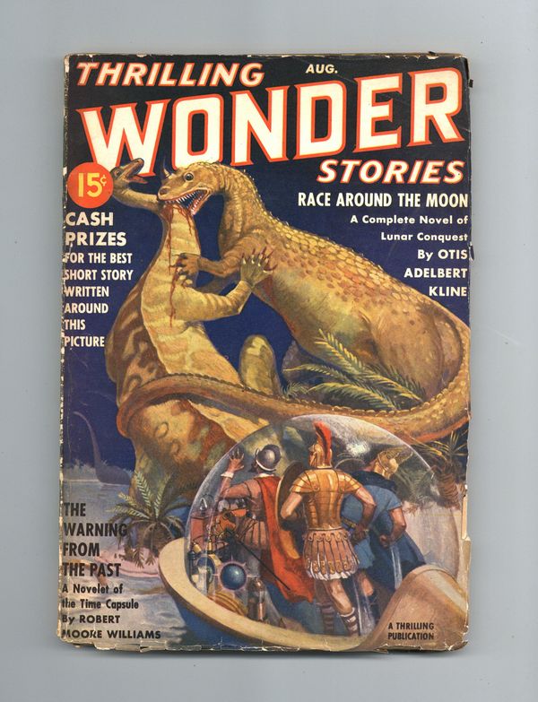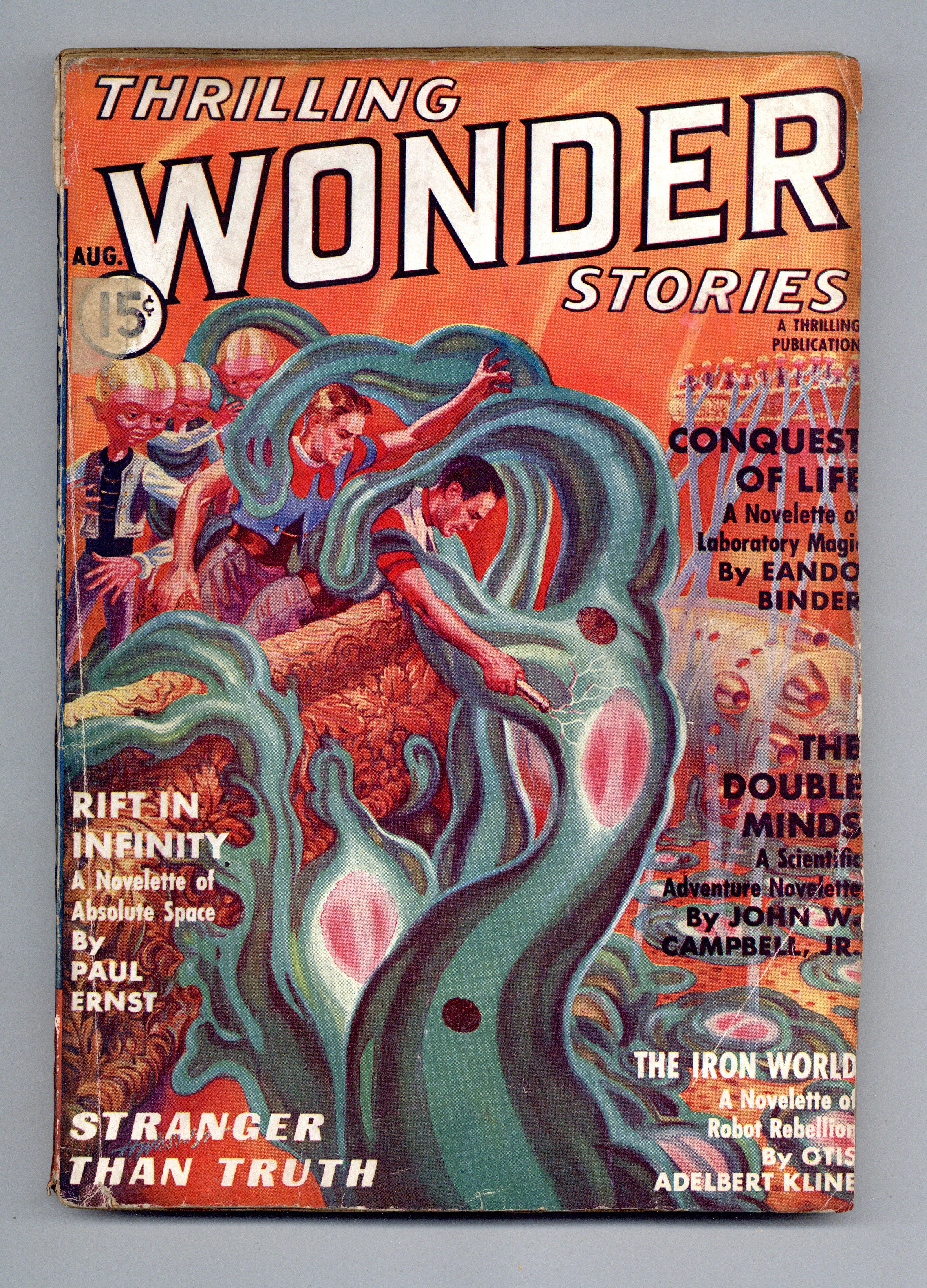 August 1937. Stories by Eando Binder, John W. Campbell Jr., Paul Ernst, Otis Adelbert Kline, Edmond Hamilton, J. Harvey Haggard, Gordon A. Giles, and S.K. Bernfeld. "Zarnak" comic story by Max Plaisted. 7-in. x 10-in.; black and white; 128 newsprint pages. Cover price $0.15.