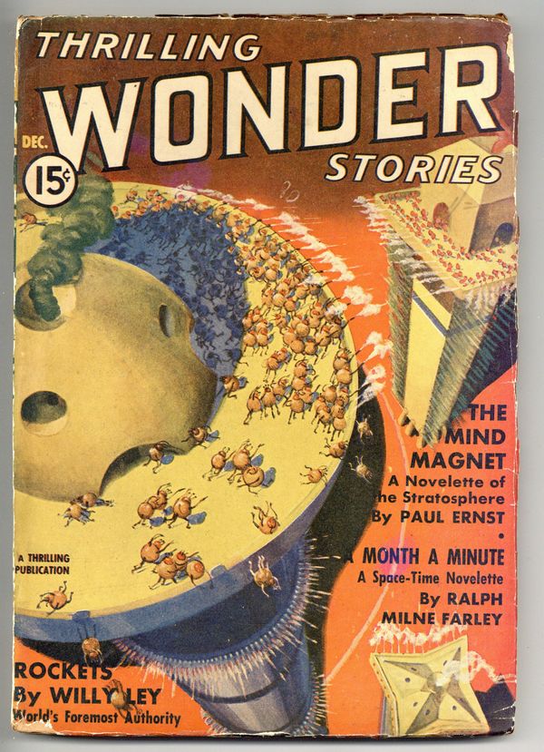 Dec 1937. Stories by Paul Ernst, Ralph Milne Farley, Willy Ley, John W. Campbell Jr., Raymond Z. Gallun, Robert Moore Williams, Edmond Hamilton, and Will Garth. 7-in. x 10-in.; black and white; 128 newsprint pages. Cover price $0.15.