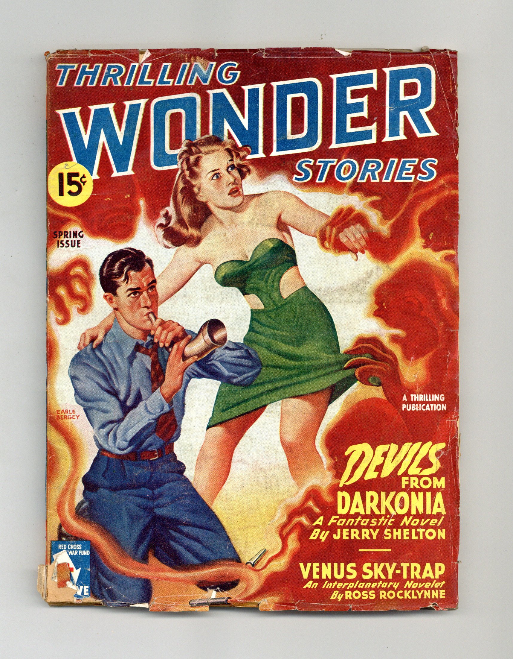 Spring 1945. Cover by Earle K. Bergey. Jerry Shelton, Ross Rocklynne, Henry Kuttner, Arthur G. Strangland, Frederic Arnold Kummer Jr., Polton Cross, and Sam Merwin Jr. Virgil Finlay illustration. 7-in. x 10-in.; black and white; 112 newsprint pages. Cover price $0.15.