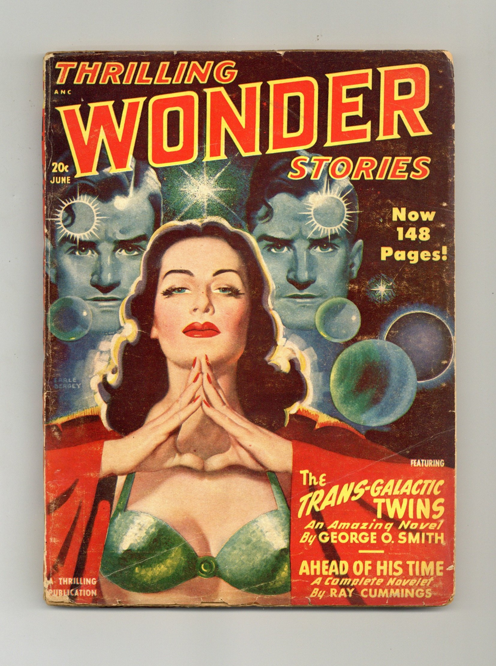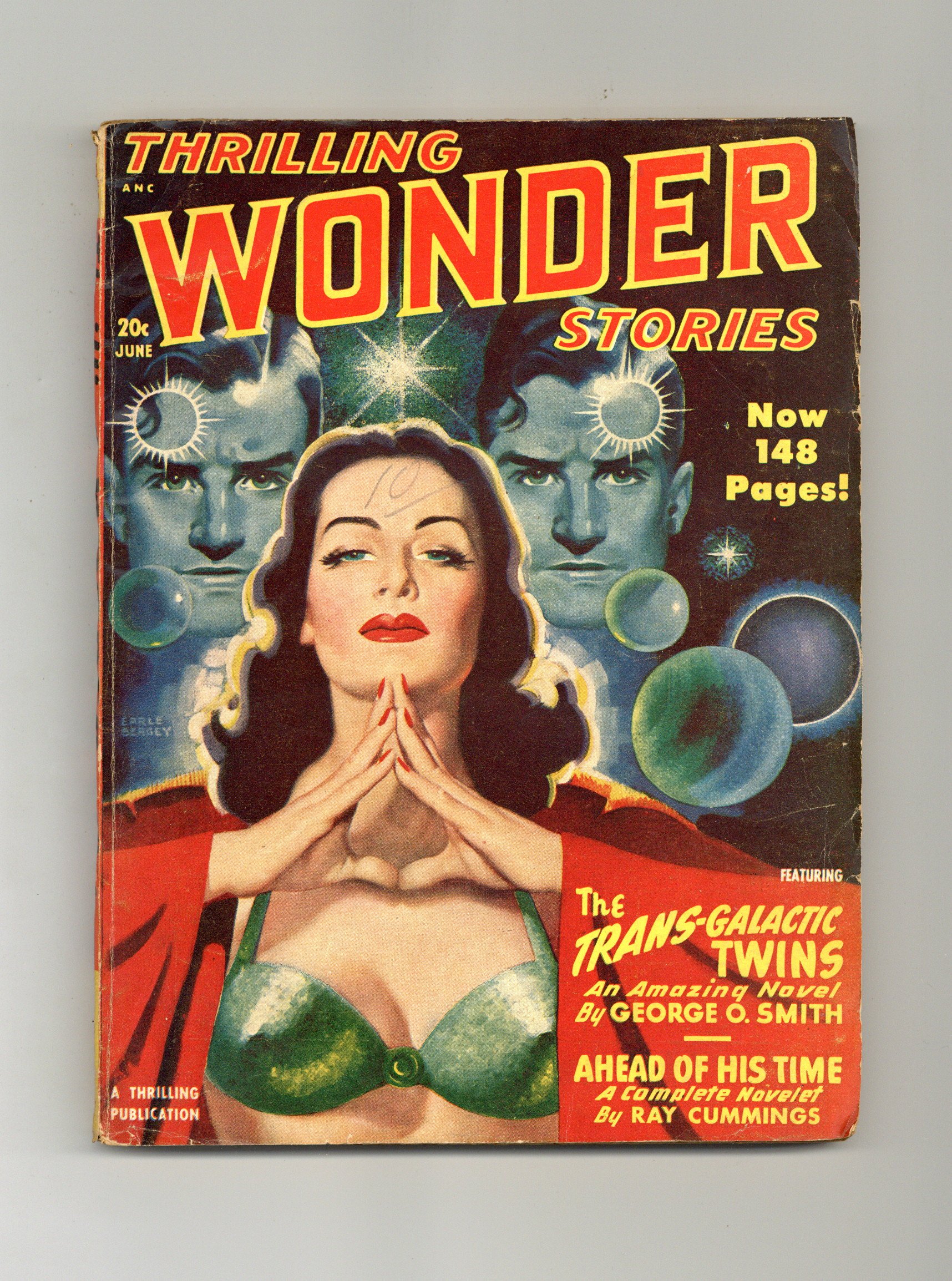 June 1948. Cover by Earle K. Bergey. Stories by George O. Smith, Ray Cummings, Ray Bradbury, William Tenn, William F. Temple, Margaret St. Clair, Edmond Hamilton, and Murray Leinster. Five Virgil Finlay illustrations. 7-in. x 10-in.; black and white; 146 newsprint pages. Cover price $0.20.